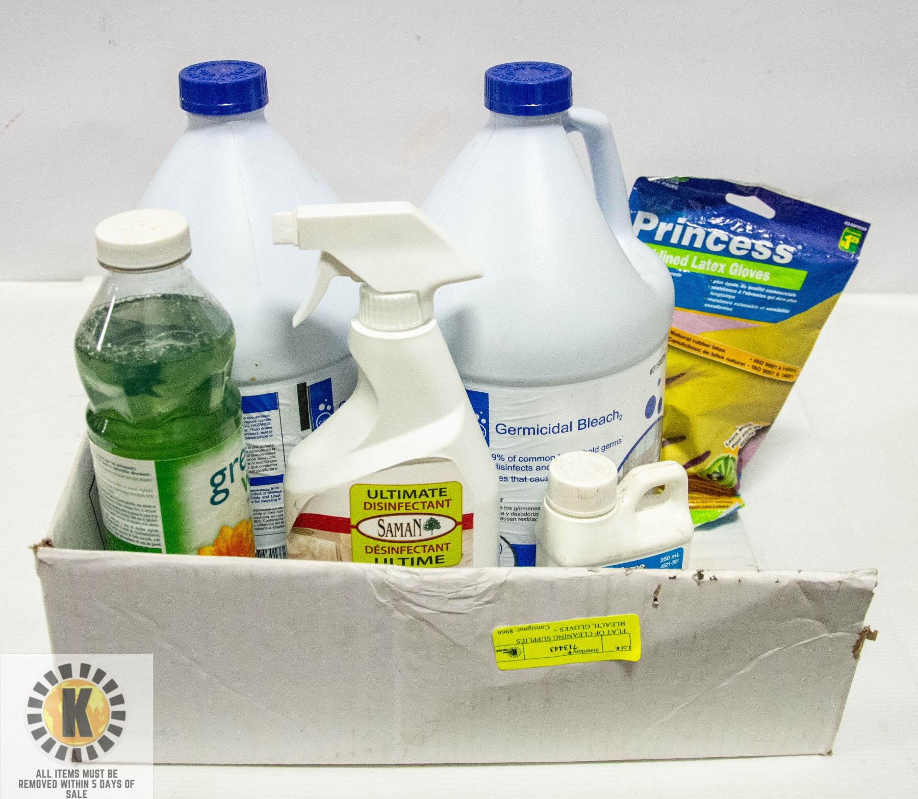 FLAT OF CLEANING SUPPLIES BLEACH, GLOVES +