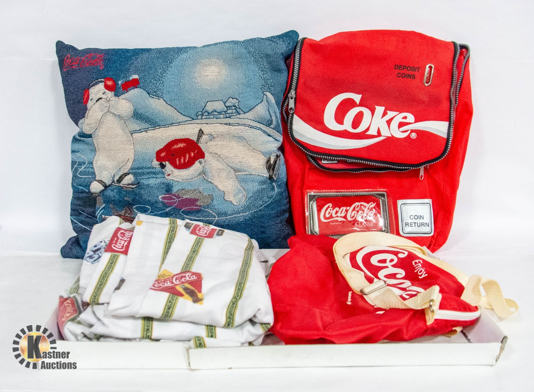 FLAT OF COCA COLA COLLECTABLES, PILLOW BED SHEETS