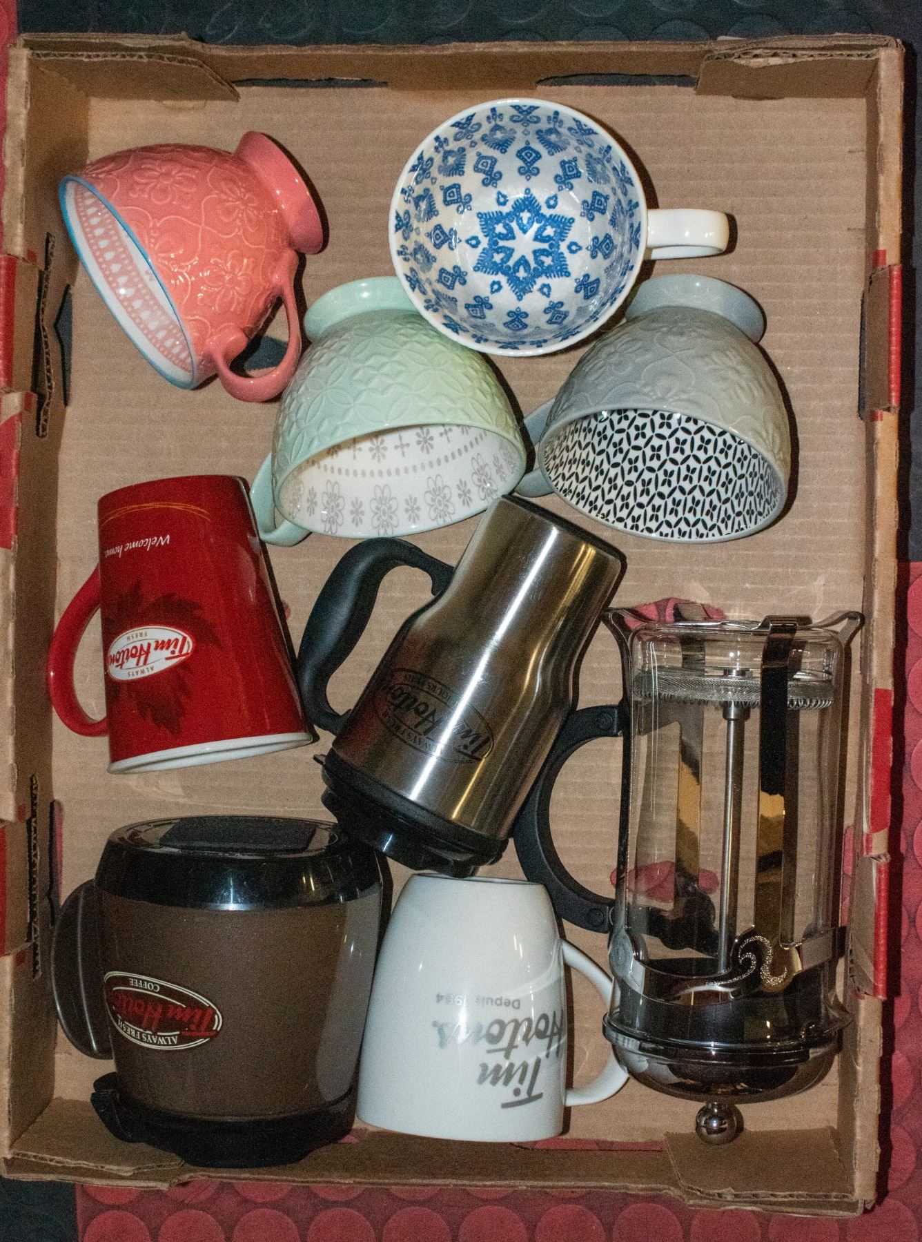 PRESS INCLUDING NEW STARBUCKS FRENCH PRESS, TIM HORTONS CERAMIC MUGS, 2 TIMS TRAVEL MUGS, SET OF 4 NEW STONEWARE DECORATIVE MUGS **ALL ITEMS MUST BE REMOVED BY 5PM SATURDAY, JANUARY 28TH 2023. **ALL REMAINING ITEMS WILL BE SUBJECT TO A $6.00 PER DAY STORAGE CHARGE. ANY ITEMS REMAINING AFTER MONDAY, FEBRUARY 13TH, 2023 WILL BE CONSIDERED FORFEITED. NO REFUNDS WILL BE ISSUED FOR FORFEITED ITEMS. TO SCHEDULE A PICK UP APPOINTMENT CLICK HERE