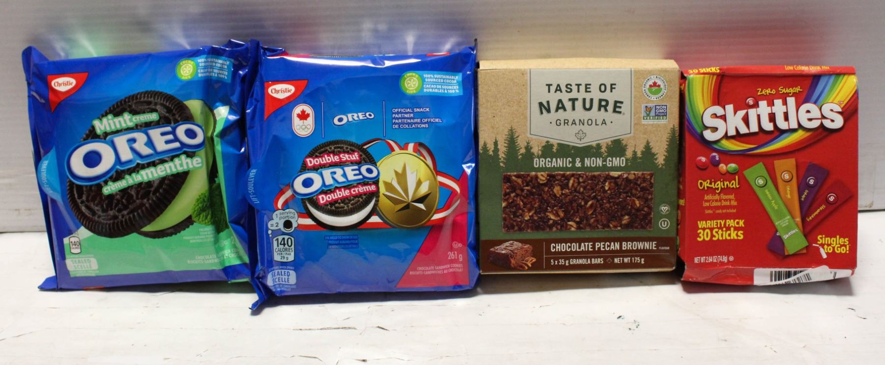 FLAT OF COOKIES, GRANOLA BARS AND DRINK FLAVORING