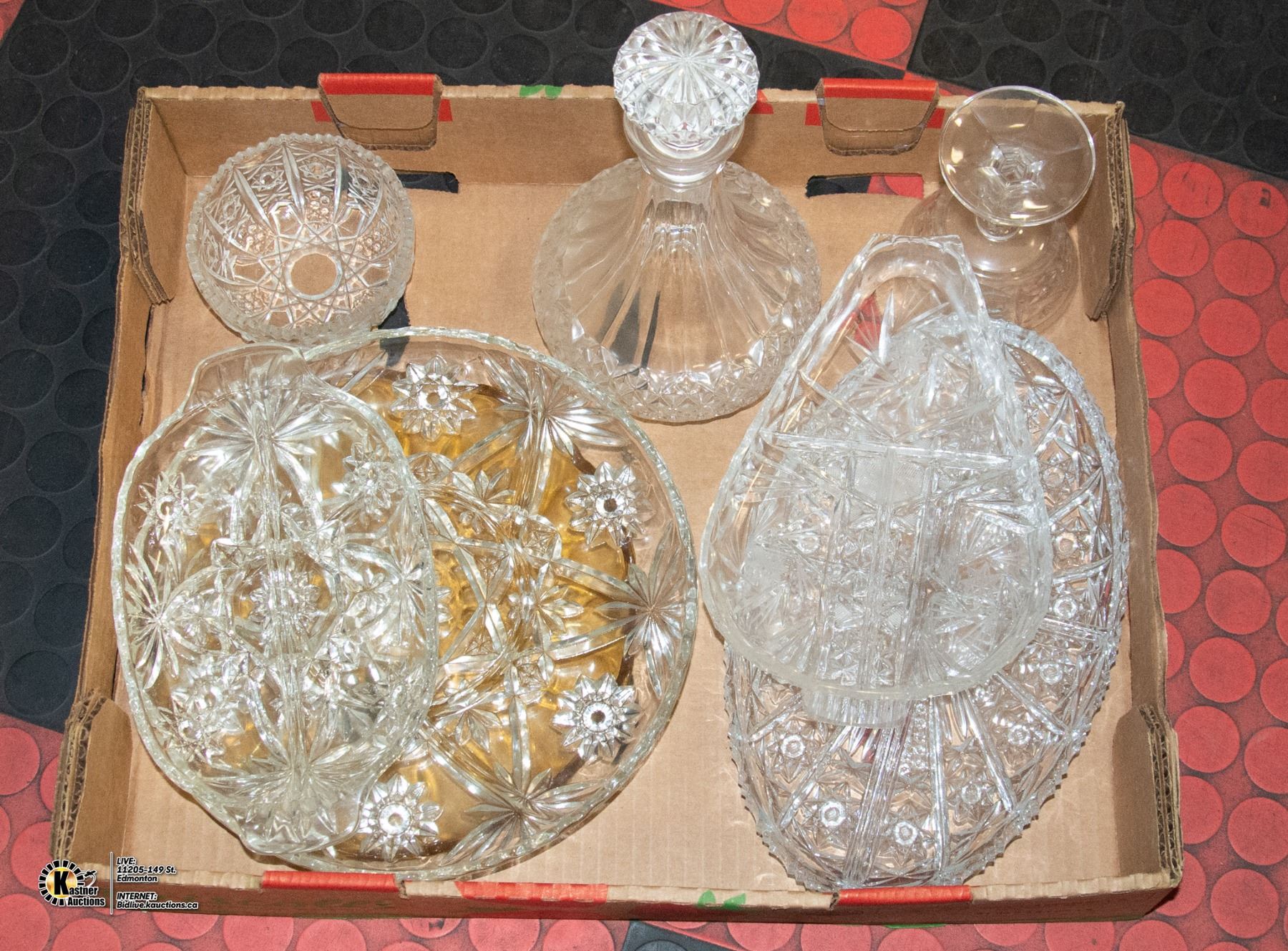 FLAT OF CRYSTAL SERVING DISHES AND DECANTER