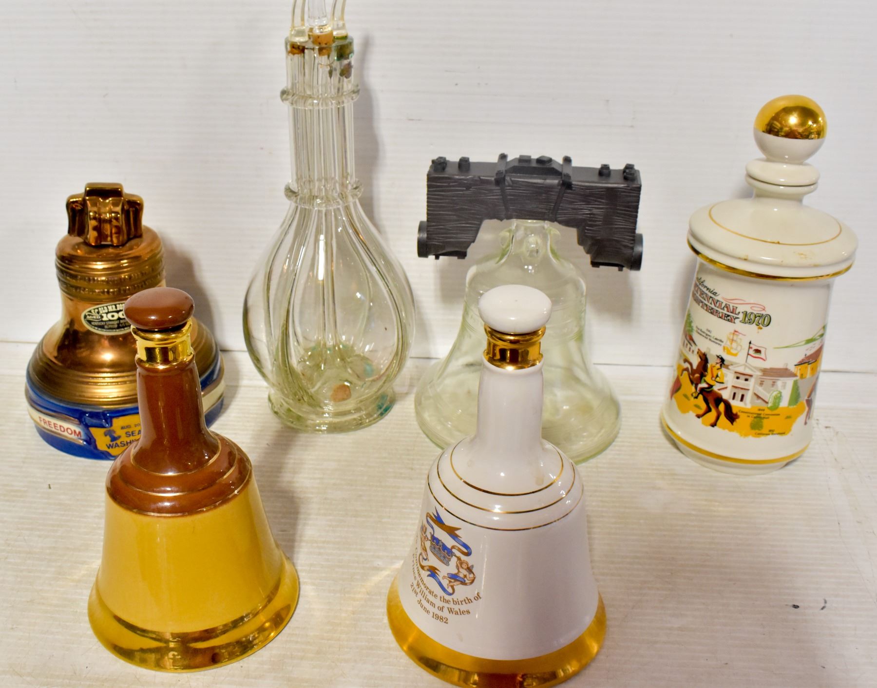 FLAT OF DECANTERS INCLUDES BELL SHAPED BOTTLE