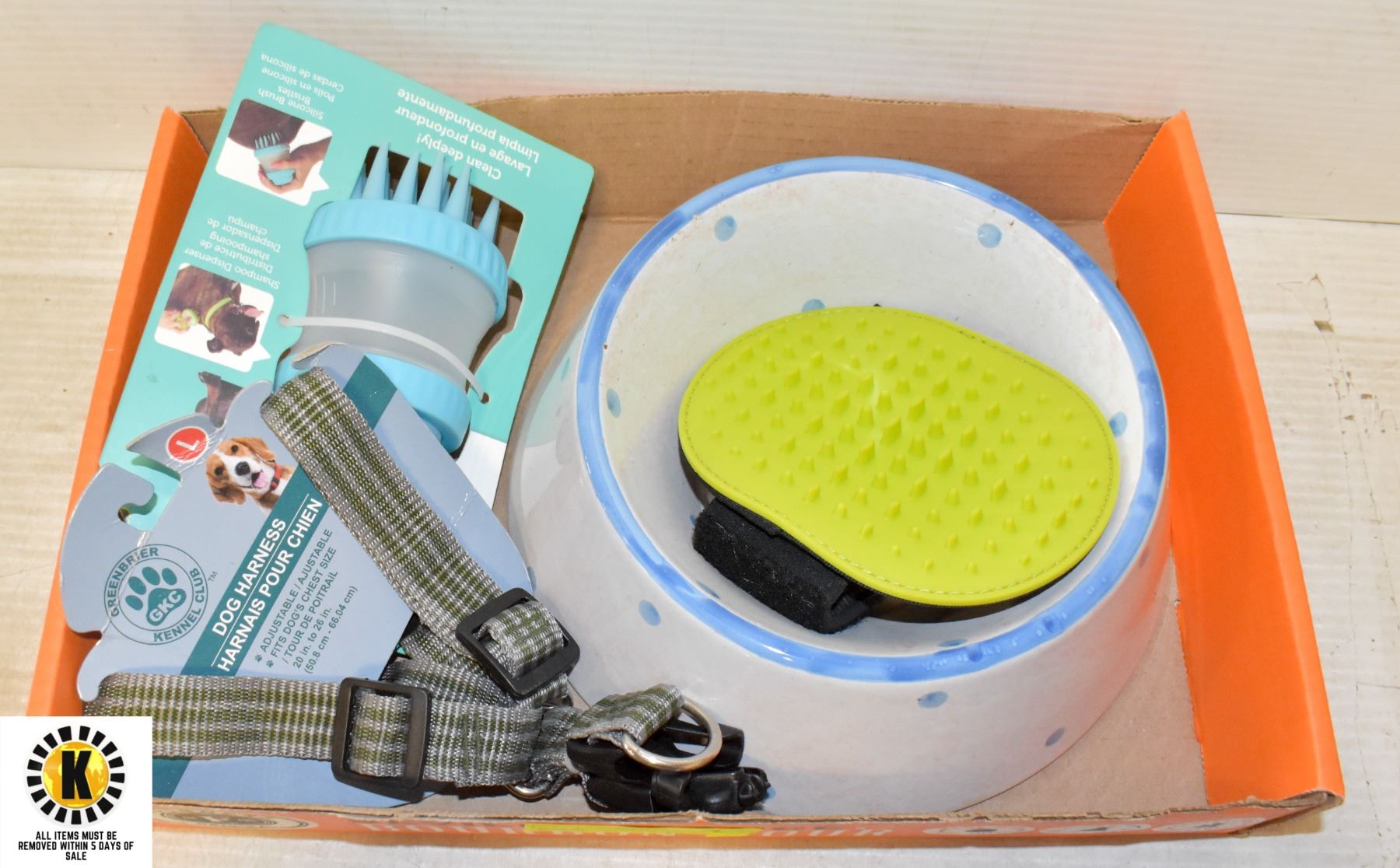 FLAT OF DOG ITEMS - LEASH, BOWL, WASHER