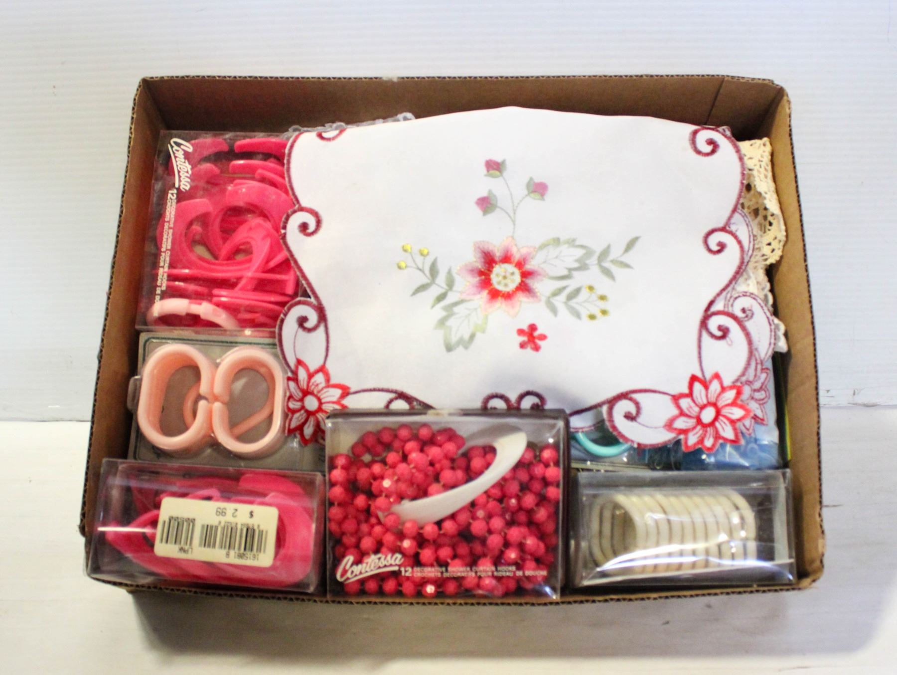 FLAT OF DOILIES,SHOWER CURTAIN LINERS N RINGS