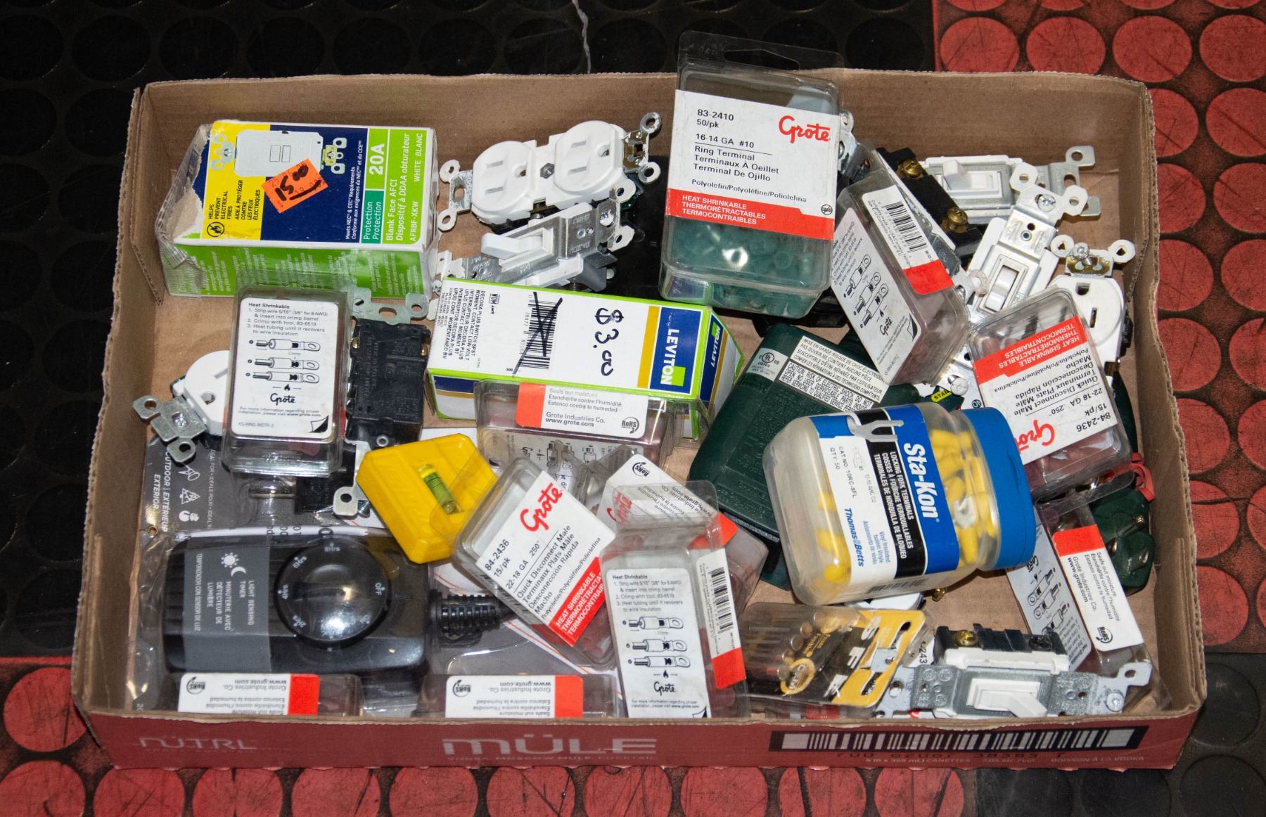 FLAT OF ELECTRICAL ITEMS, STAKONS,