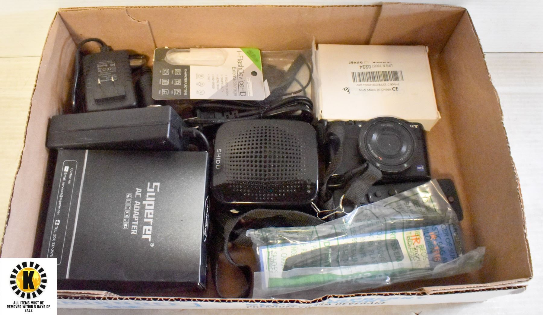 INCLUDES BLUETOOTH AMPLIFIER, REMOTES, VOICE AMPLIFIER, FLASH DEVICE, ADAPTERS, SONY CAMERA UNTESTED