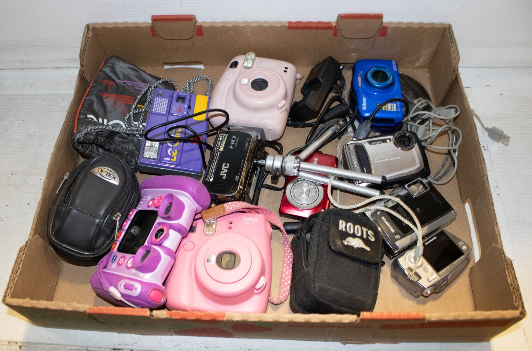 JVC HANDICAM, COOLPIX, INSTAX MINI 9, OLYMPUS "TOUGH" SHOCKPROOF/WATERPROOF, FUJI FILM XP (WATER, SHOCK, DUST, FREEZE PROOF), LE CLIC CAMERA, CASES, CORDS, TRI-POD, ETC.