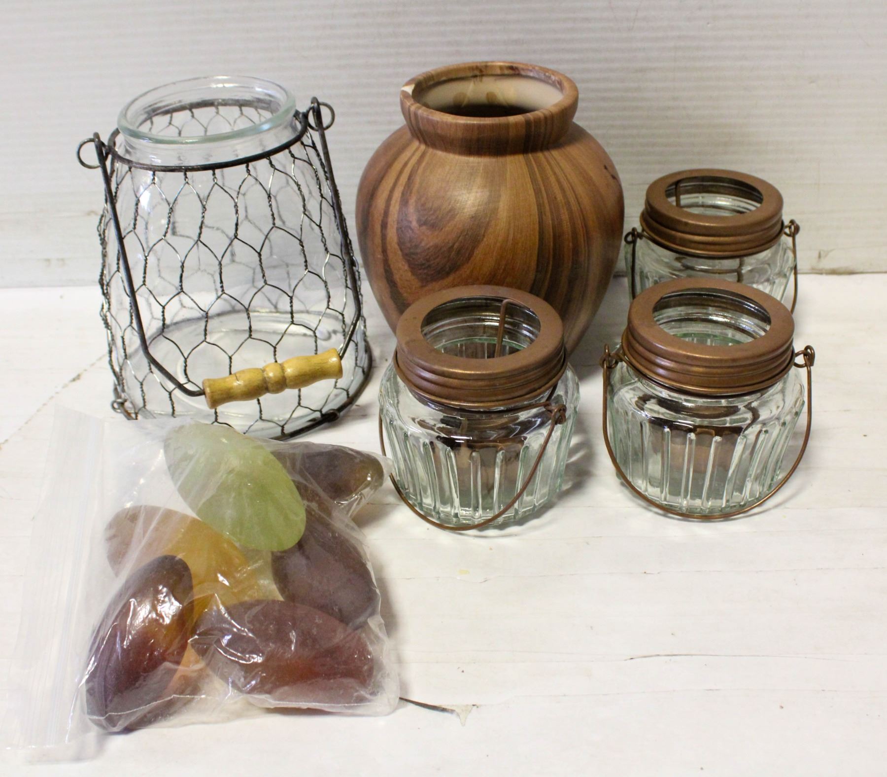3 VOTIVE CANDLE JARS W THREAD LIDS, 1 CHICKEN WIRE WRAPPED JAR, 1 FAUX WOOD VASE, BAG OF LARGE GLASS OVAL STONES