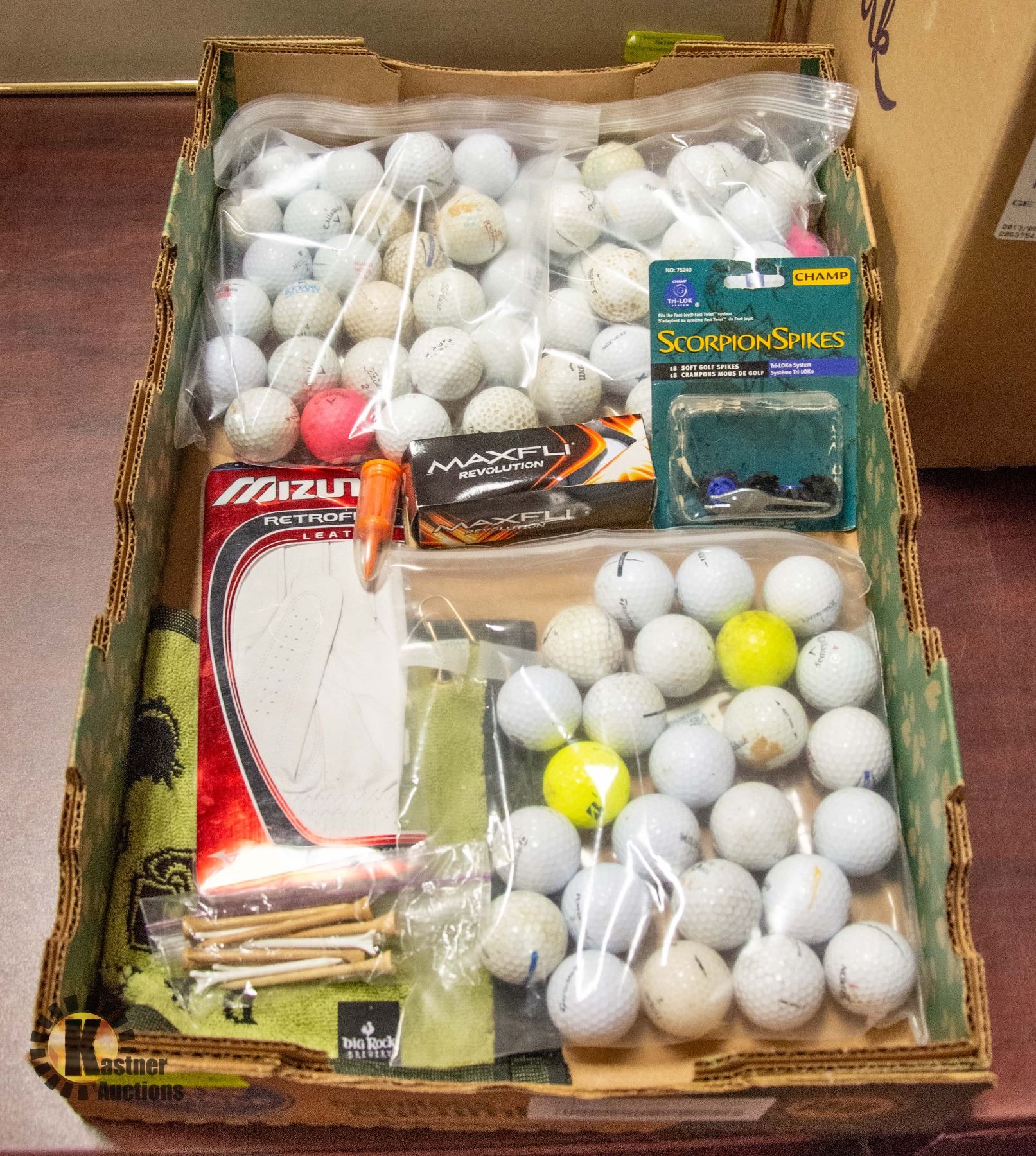 INCLUDING NEW MIZUNO MEN'S LARGE LEFT HAND GOLF GLOVE, NEW MAXFLI REVOLUTION BALL SLEEVE, NEW BIG ROCK TOWEL AND APPROX. 90 VARIOUS GOLF BALLS, TEES, SCORPION SPIKES, ETC. **ALL ITEMS MUST BE REMOVED BY 5PM SATURDAY, APRIL 15TH 2023. ALL REMAINING ITEMS WILL BE SUBJECT TO A $6.00 PER DAY STORAGE CHARGE. ANY ITEMS REMAINING AFTER MONDAY, APRIL 30TH, 2023 WILL BE CONSIDERED FORFEITED. NO REFUNDS WILL BE ISSUED FOR FORFEITED ITEMS. TO SCHEDULE A PICK UP APPOINTMENT CLICK HERE