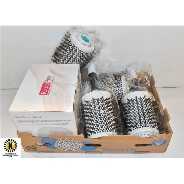 FLAT OF 4 NEW HAIR BRUSHES AND 1 NEW MANICURE STATION