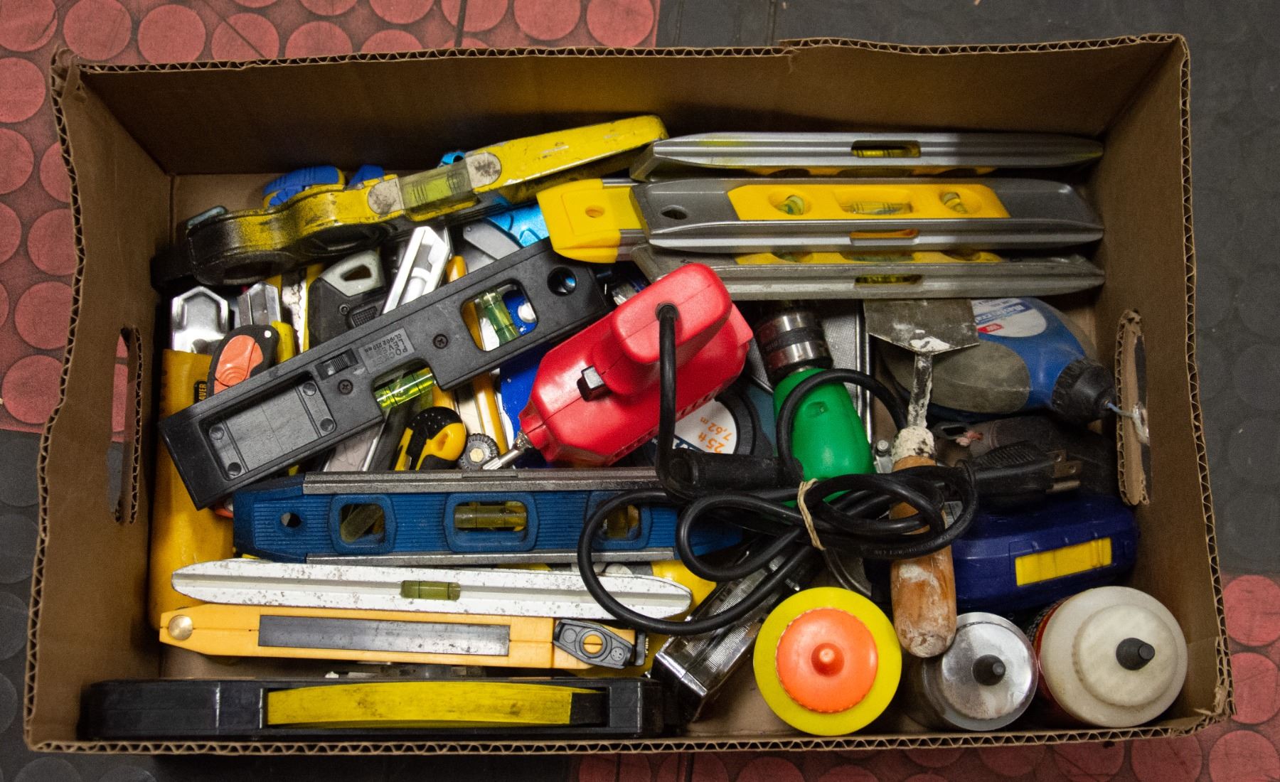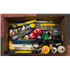 FLAT OF HAND TOOLS - CHALK LINE, KNIVES, SOLDERING IRON, POCKET LEVELS, TAPE MEASURES