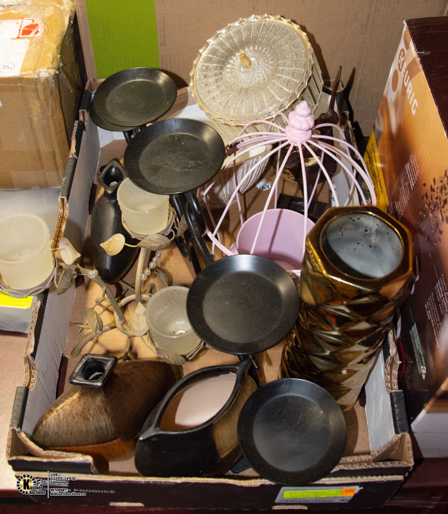 FLAT OF HOUSEHOLD DECOR VASES + CANDLEHOLDERS