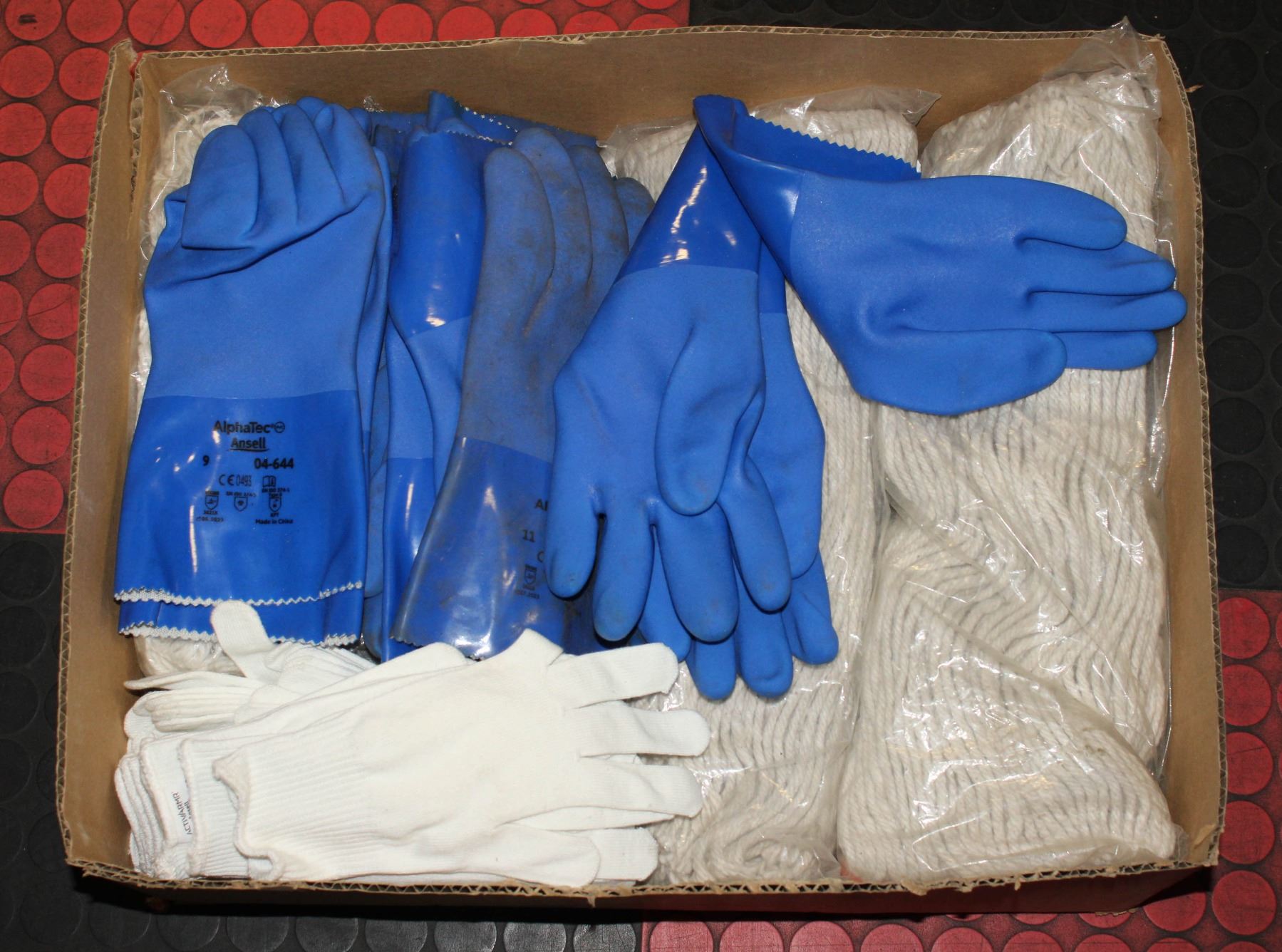 FLAT OF JANITORIAL MOP HEADS, GLOVES