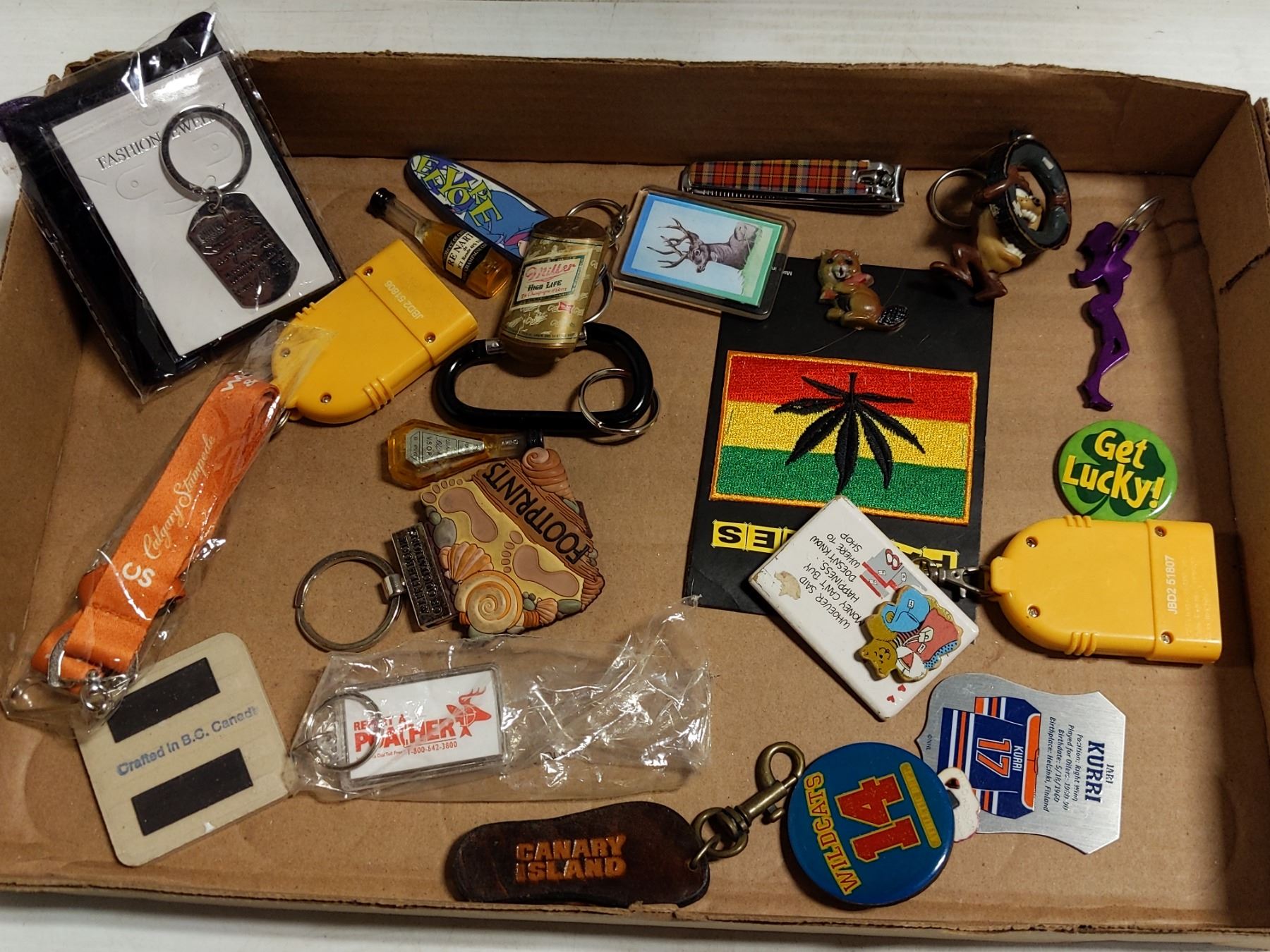 FLAT OF KEYCHAINS, PATCHES & MORE