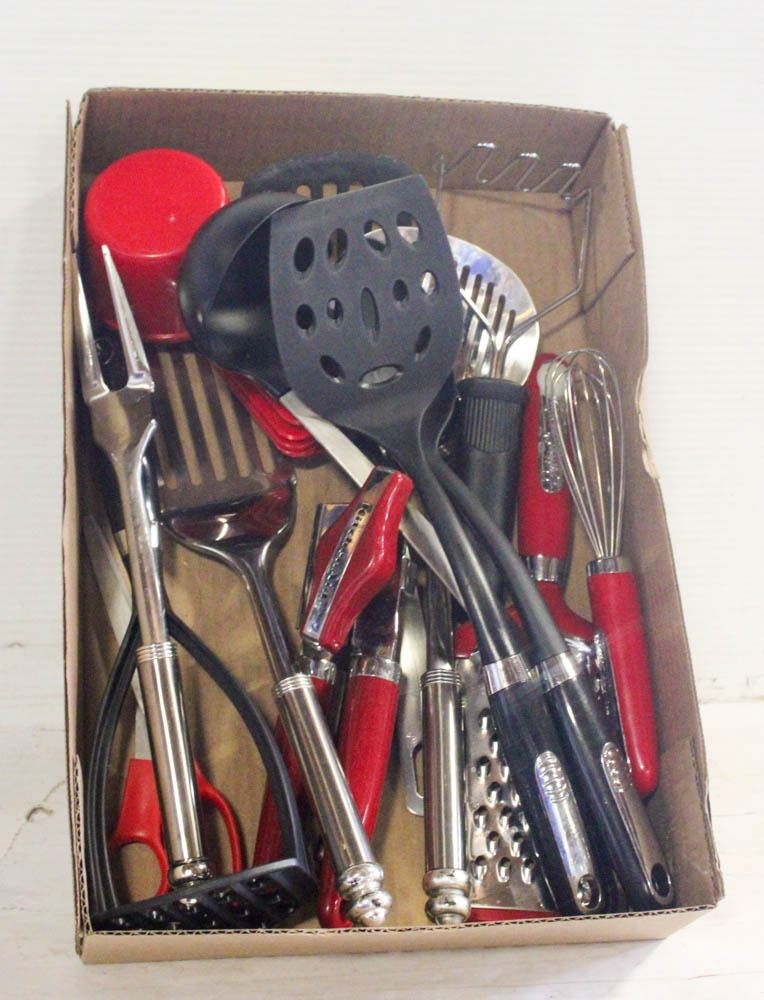 FLAT OF KITCHEN UTENSILS WITH CAN OPENERS ETC