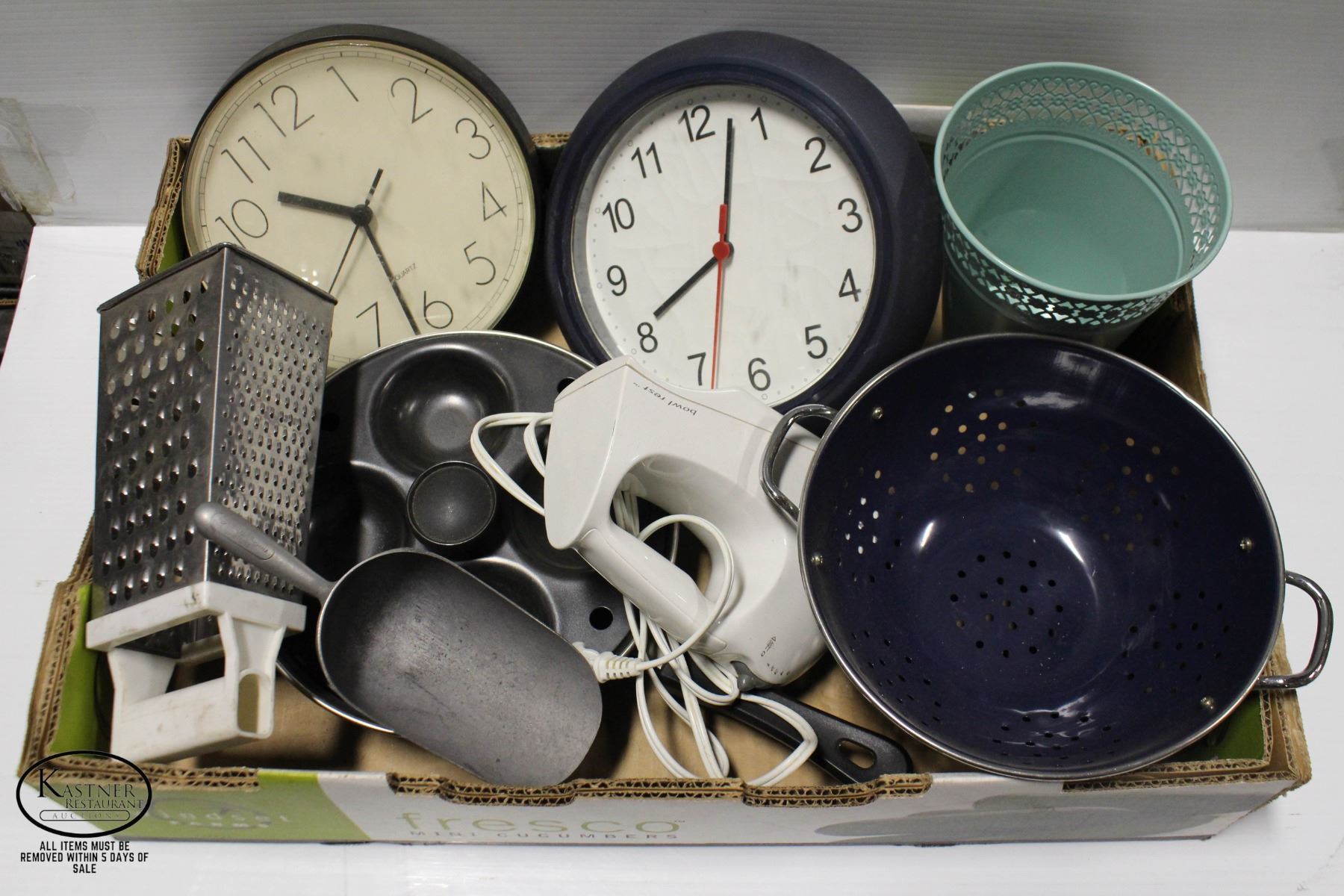 FLAT OF KITCHENWARES INCL: EGG BEATER, DEVILED EGG