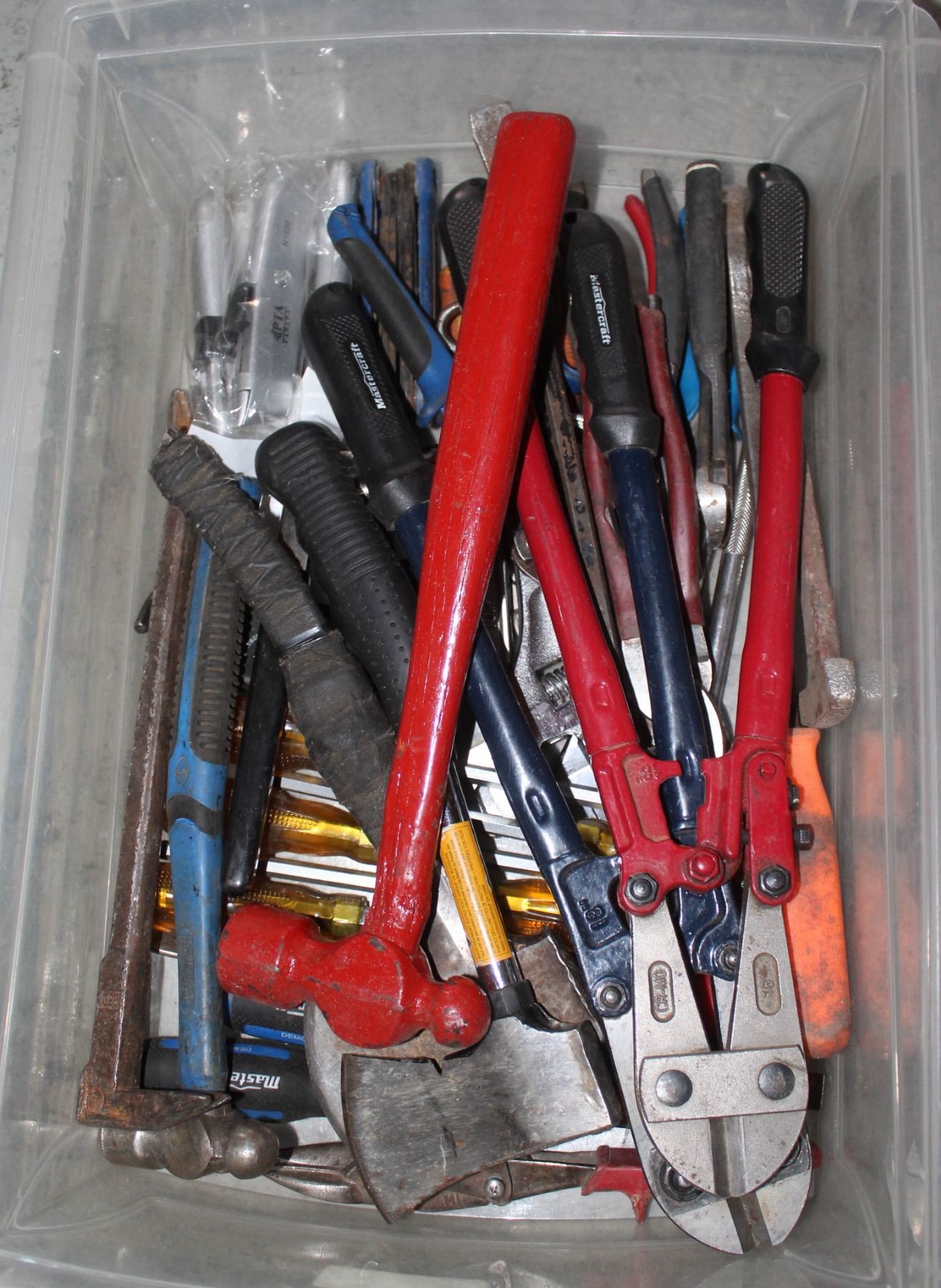 FLAT OF LOTS OF HAND TOOLS, AXES, BOLT CUTTERS...