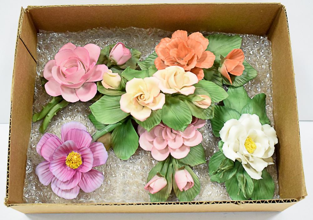 FLAT OF MIXED PORCELIAN FLOWER DECOR PIECES