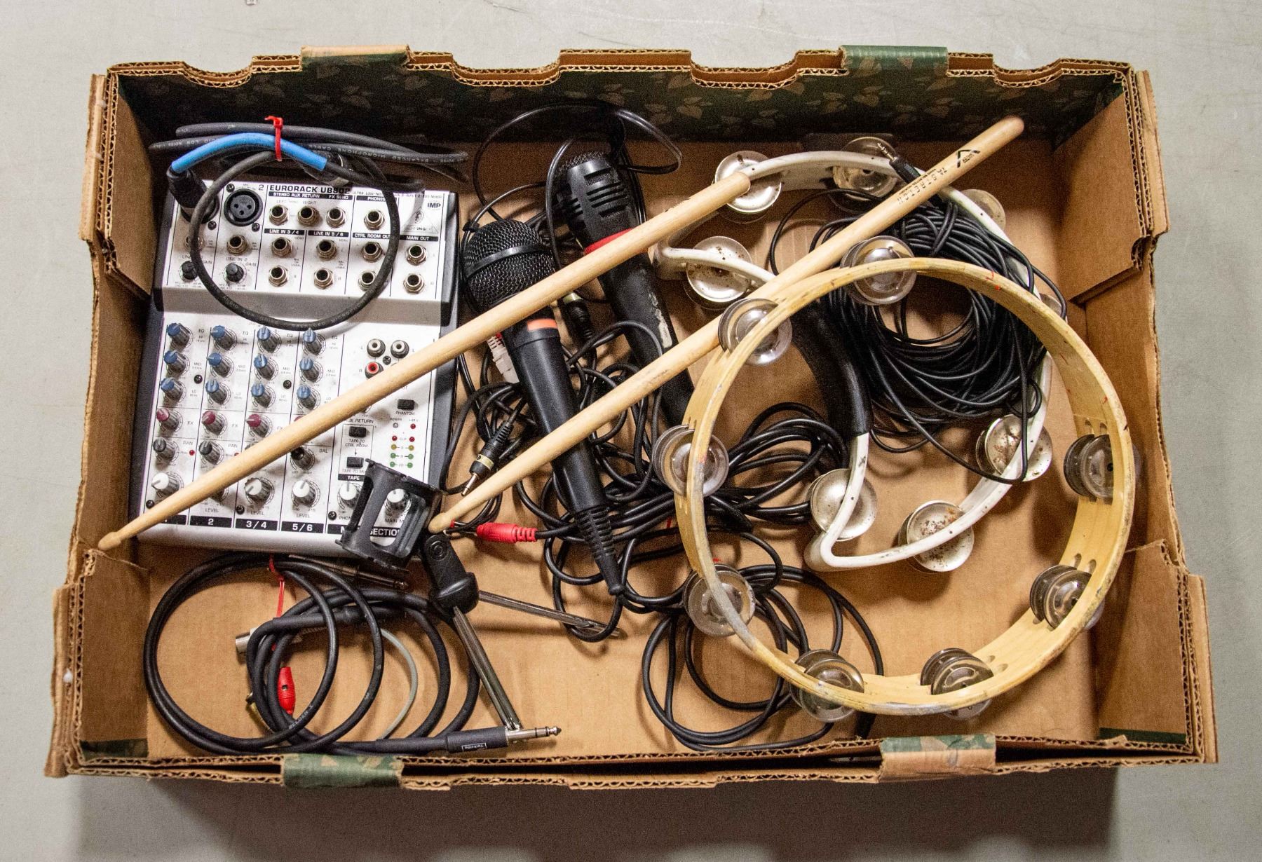 MICROPHONES - BEHRINGER EURORACK UB802 MIXER, 2 STAGE MICROPHONES, TABLE TOP MIC STAND, DRUMSTICKS, 2 TAMBOURINES, VARIOUS QUALITY STAGE CORDS