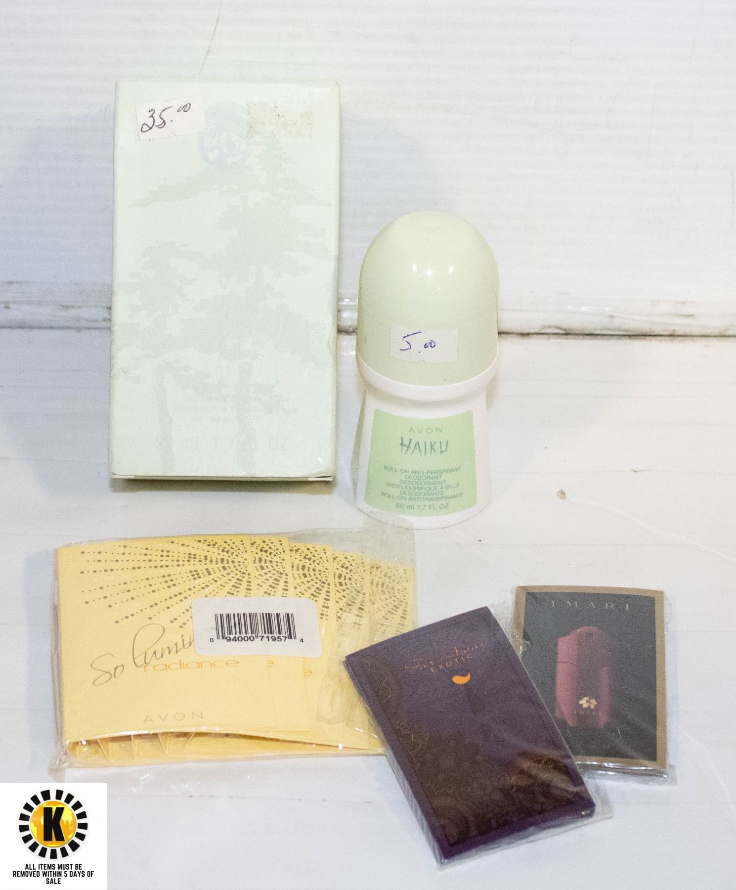 EAU DE PARFUM SPRAY ROLL ON ANTI- PERSPIRANT AND 3 NEW SEALED SAMPLE PACKS OF PERFUMES DIFFERENT SCENTS