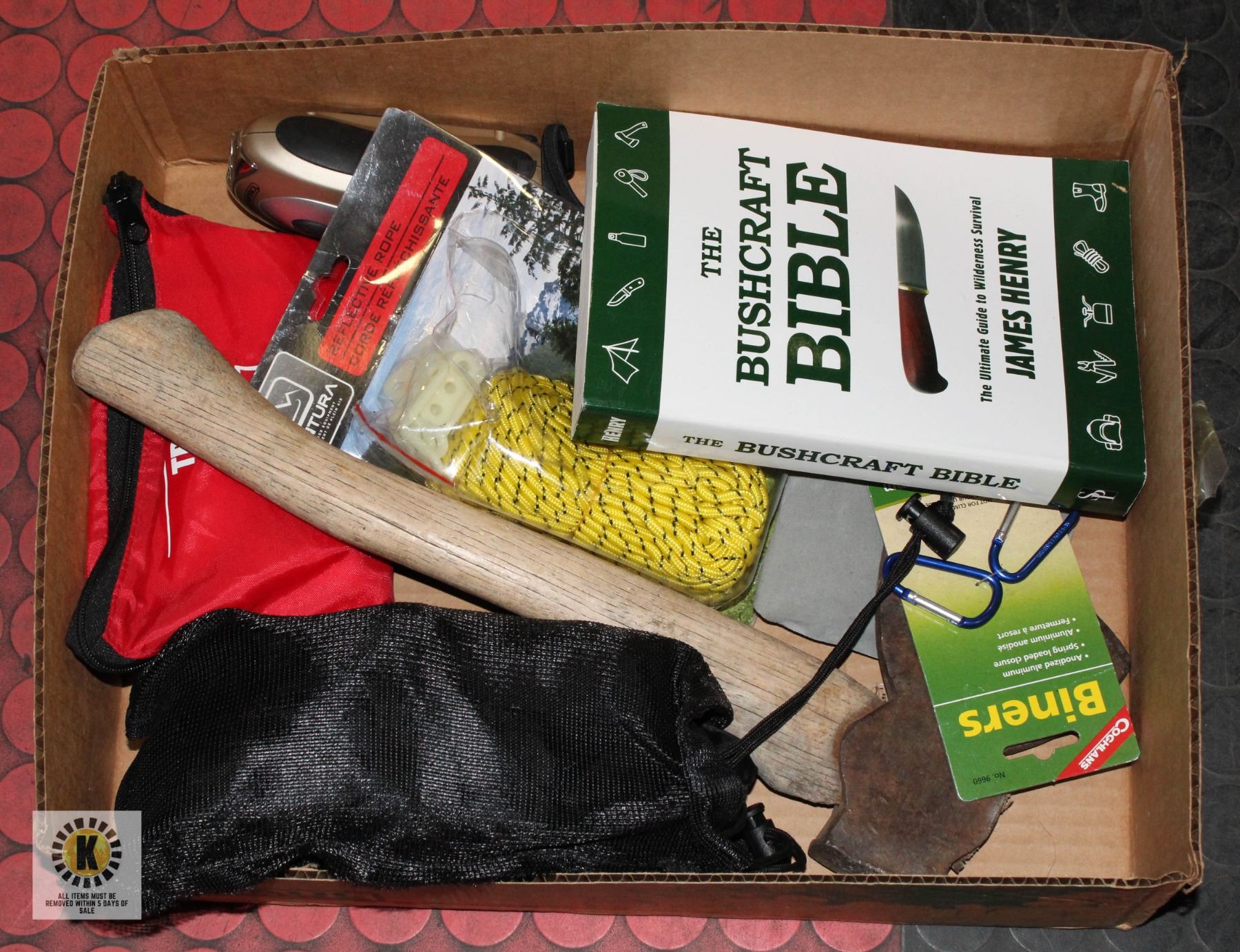 BUSHCRAFT BIBLE, NEW REFLECTIVE ROPE, NEW CARABINERS, WATERPROOF JACKET, FIRST AID KIT, CHOPPING HATCHET, ETC. **ALL ITEMS MUST BE REMOVED BY 5PM SATURDAY, APRIL 3RD 2025. ALL REMAINING ITEMS WILL BE SUBJECT TO A $6.00 PER DAY STORAGE CHARGE. ANY ITEMS REMAINING AFTER MONDAY, MAY 19TH 2025 WILL BE CONSIDERED FORFEITED. NO REFUNDS WILL BE ISSUED FOR FORFEITED ITEMS. TO SCHEDULE A PICK UP APPOINTMENT CLICK HERE
