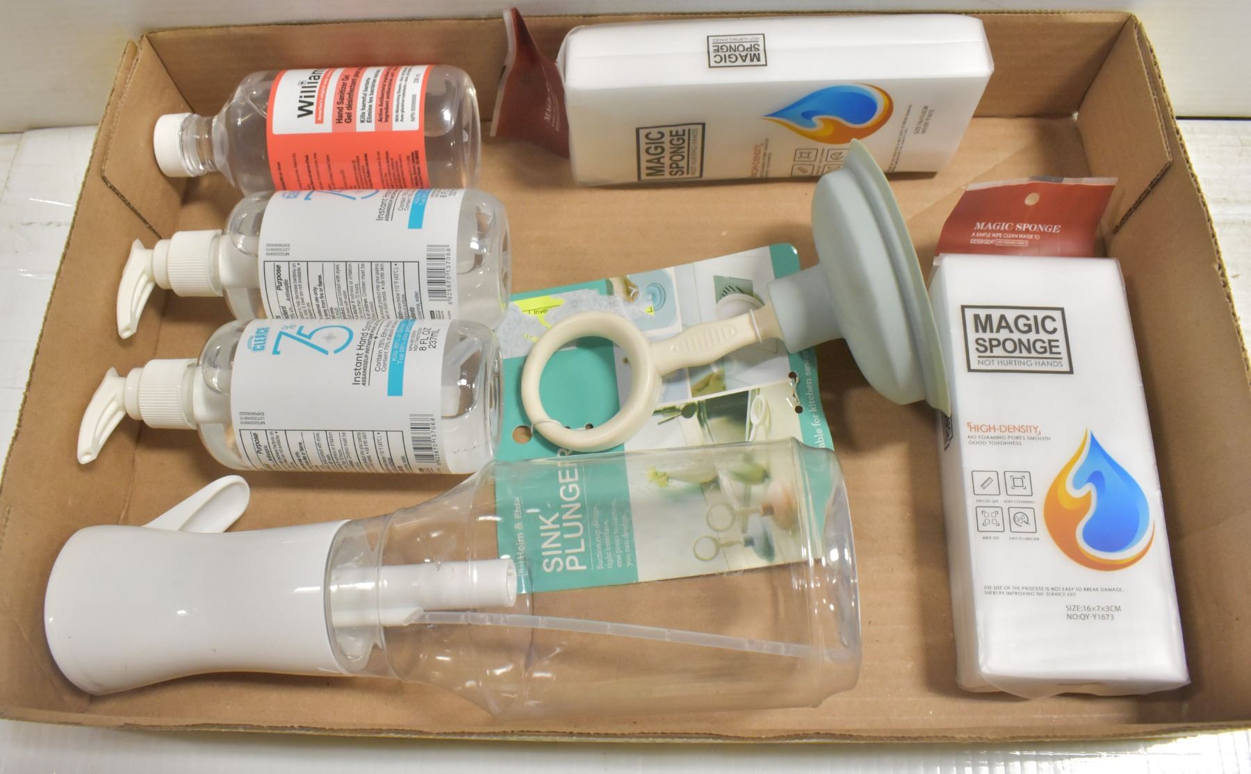 MAGIC SPONGES, 3 NEW BOTTLES HAND SANITIZER,NEW MINI SINK PLUNGER & 15 OZ 360 DEGREE MISTER SPRAY BOTTLE (TESTED WITH WATER) **ALL ITEMS MUST BE REMOVED BY 5PM SATURDAY, DECEMBER 10TH 2022. ALL REMAINING ITEMS WILL BE SUBJECT TO A $6.00 PER DAY STORAGE CHARGE. ANY ITEMS REMAINING AFTER MONDAY, DECEMBER 25TH, 2022 WILL BE CONSIDERED FORFEITED. NO REFUNDS WILL BE ISSUED FOR FORFEITED ITEMS. TO SCHEDULE A PICK UP APPOINTMENT CLICK HERE