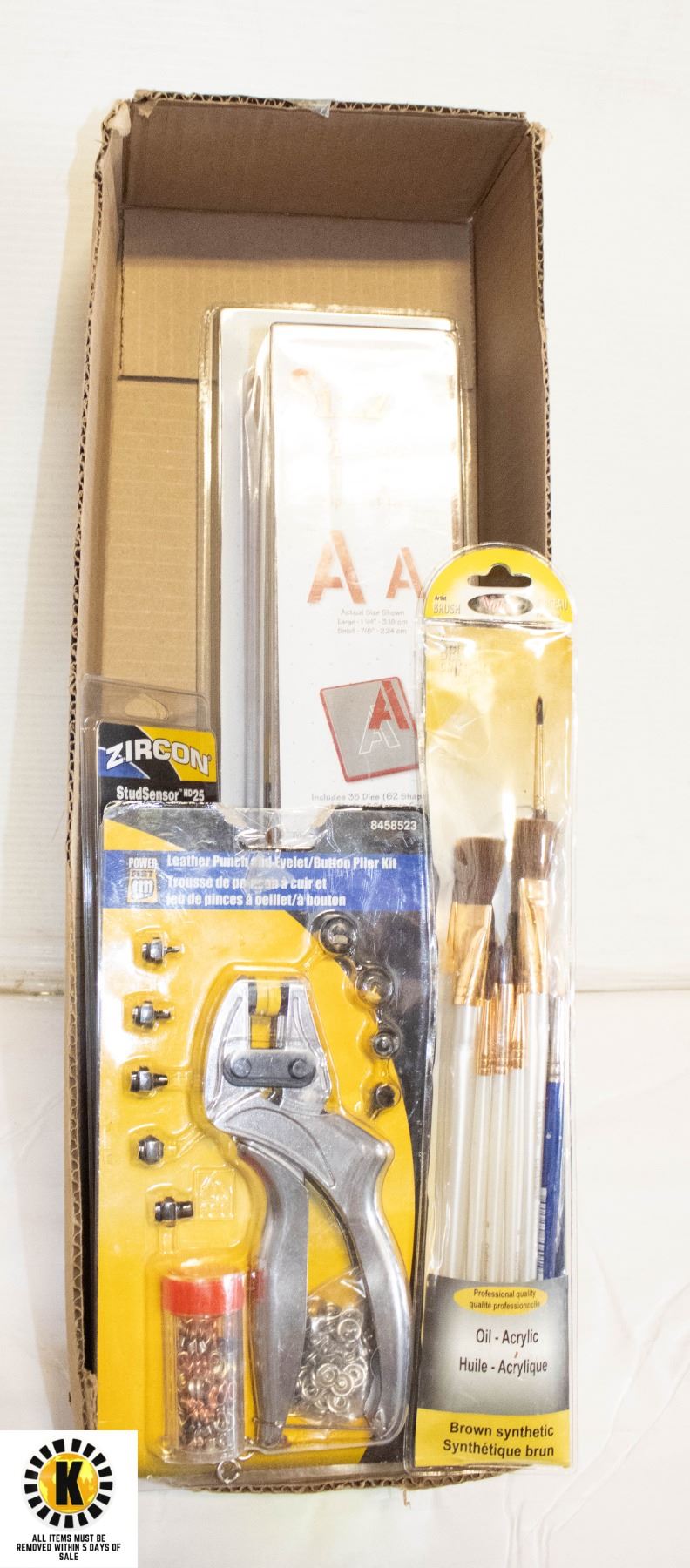 PUNCH & EYELET/BUTTON PLIER KIT, PAINT BRUSHES, STUD SENSOR HD25, & SIZZIX STENCOL ALPHABET SET