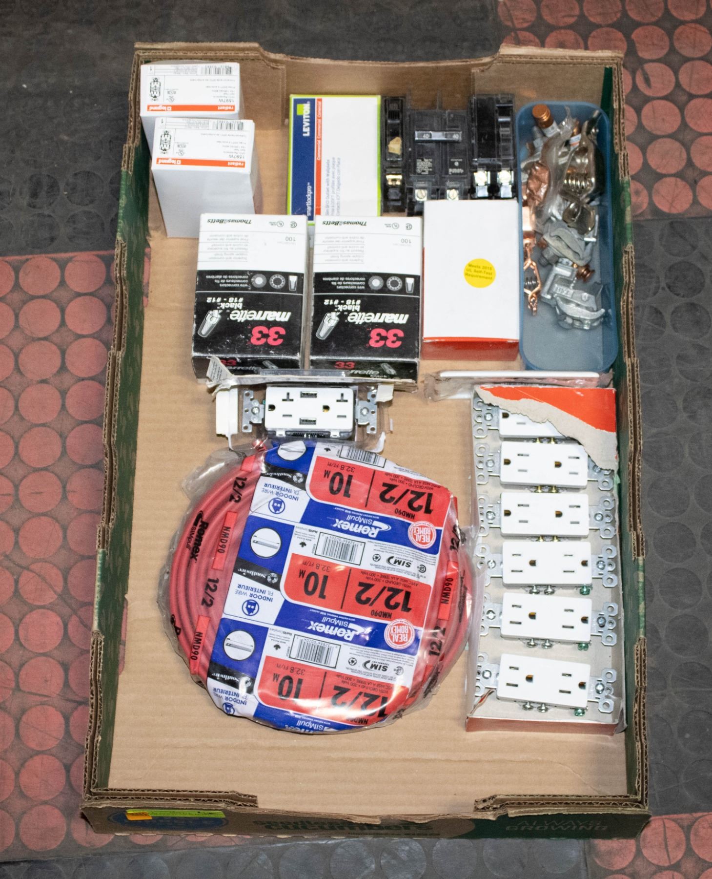 10M ROLL OF 12/2 WIRE, 2 NEW BOXES OF BLACK #18 - #12 MARRETTES, 4 NEW GFCI 15 AMP RECEPTACLES, 15-20 AND 40 AMP BREAKERS, 7 NEW WHITE DECORA RECEPTACLES, ETC. **ALL ITEMS MUST BE REMOVED BY 5PM SATURDAY, APRIL 5TH 2025. ALL REMAINING ITEMS WILL BE SUBJECT TO A $6.00 PER DAY STORAGE CHARGE. ANY ITEMS REMAINING AFTER MONDAY, APRIL 21ST 2025 WILL BE CONSIDERED FORFEITED. NO REFUNDS WILL BE ISSUED FOR FORFEITED ITEMS. TO SCHEDULE A PICK UP APPOINTMENT CLICK HERE