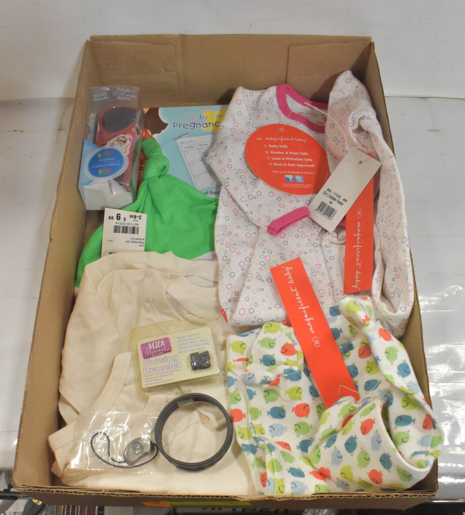 MAGNETIC CLOSE SLEEPER + PANTS, 2 NEW LONG SLEEVE ONESIES, NEW HAT (SZ 3M), 2 NEW NURSING BRACELETS + INFANT SUNGLASSES & PREGNANCY PLANNER/CALENDAR **ALL ITEMS MUST BE REMOVED BY 5PM SATURDAY, MAY 6TH 2023. ALL REMAINING ITEMS WILL BE SUBJECT TO A $6.00 PER DAY STORAGE CHARGE. ANY ITEMS REMAINING AFTER MONDAY, MAY 22ND, 2023 WILL BE CONSIDERED FORFEITED. NO REFUNDS WILL BE ISSUED FOR FORFEITED ITEMS. TO SCHEDULE A PICK UP APPOINTMENT CLICK HERE