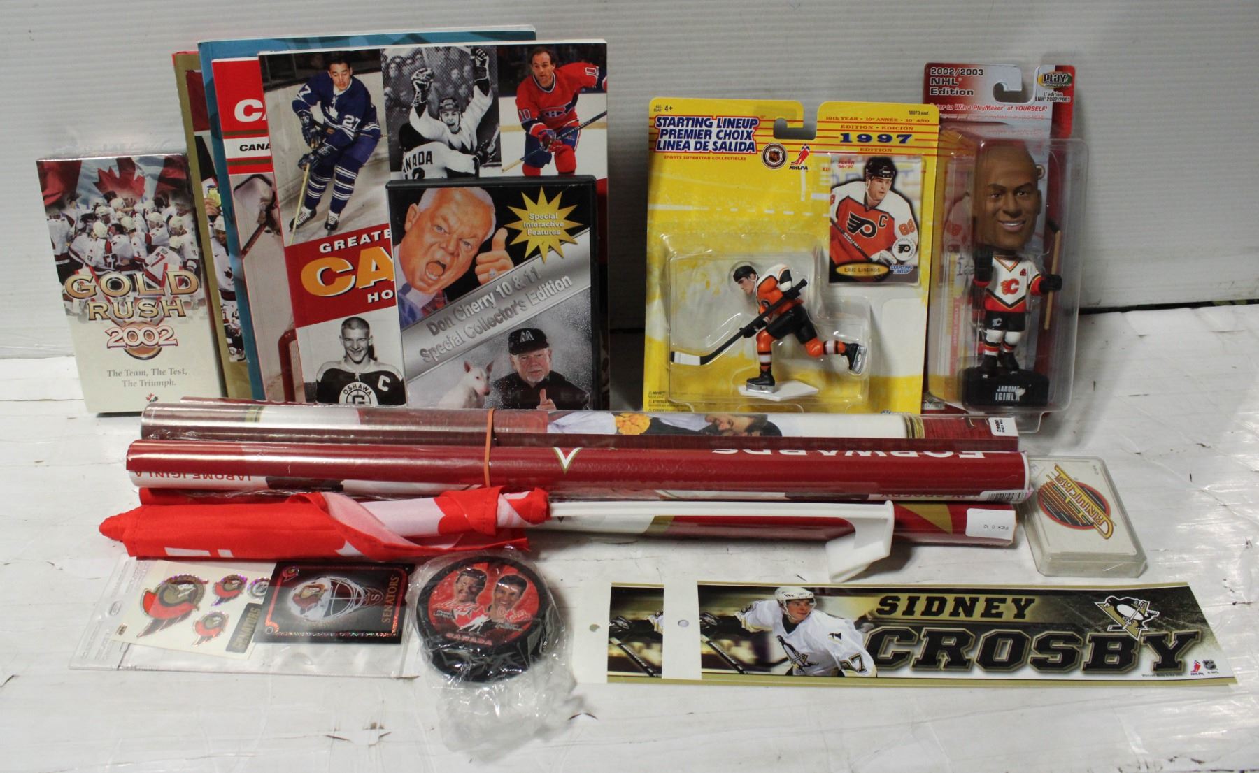 IGINLA BOBBLEHEAD, LINDROS FIGURE, HOCKEY POSTERS, BOOKS, VHS, FLAG, PUCK