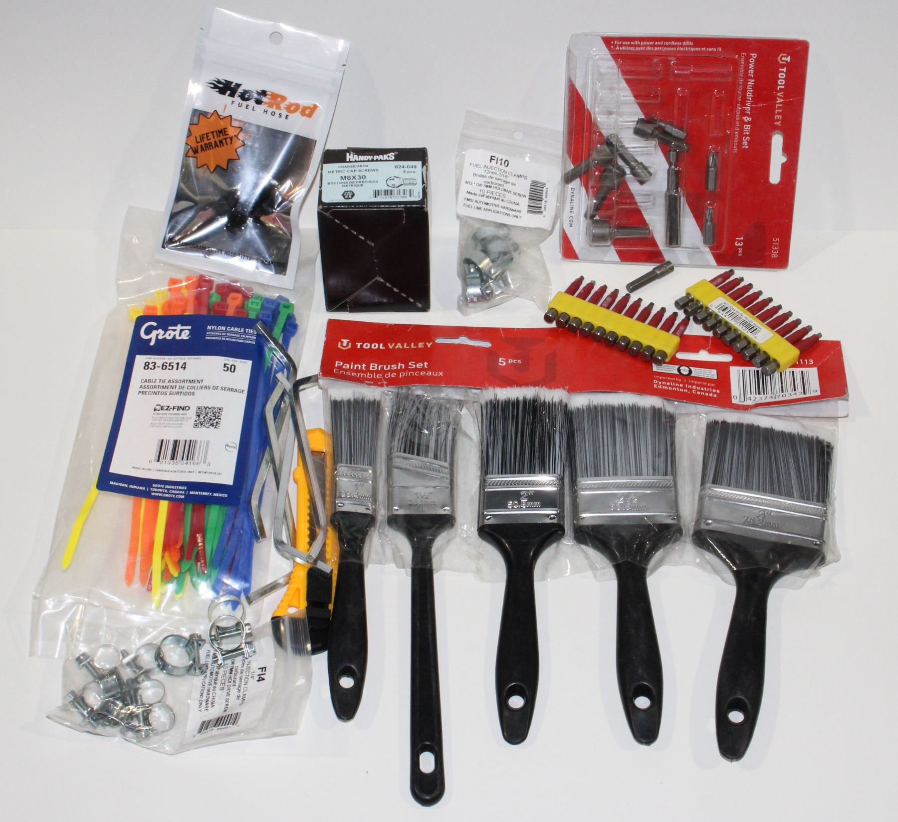 FLAT OF ODDS AND ENDS, CABLE TIES, PAINT BRUSHES,