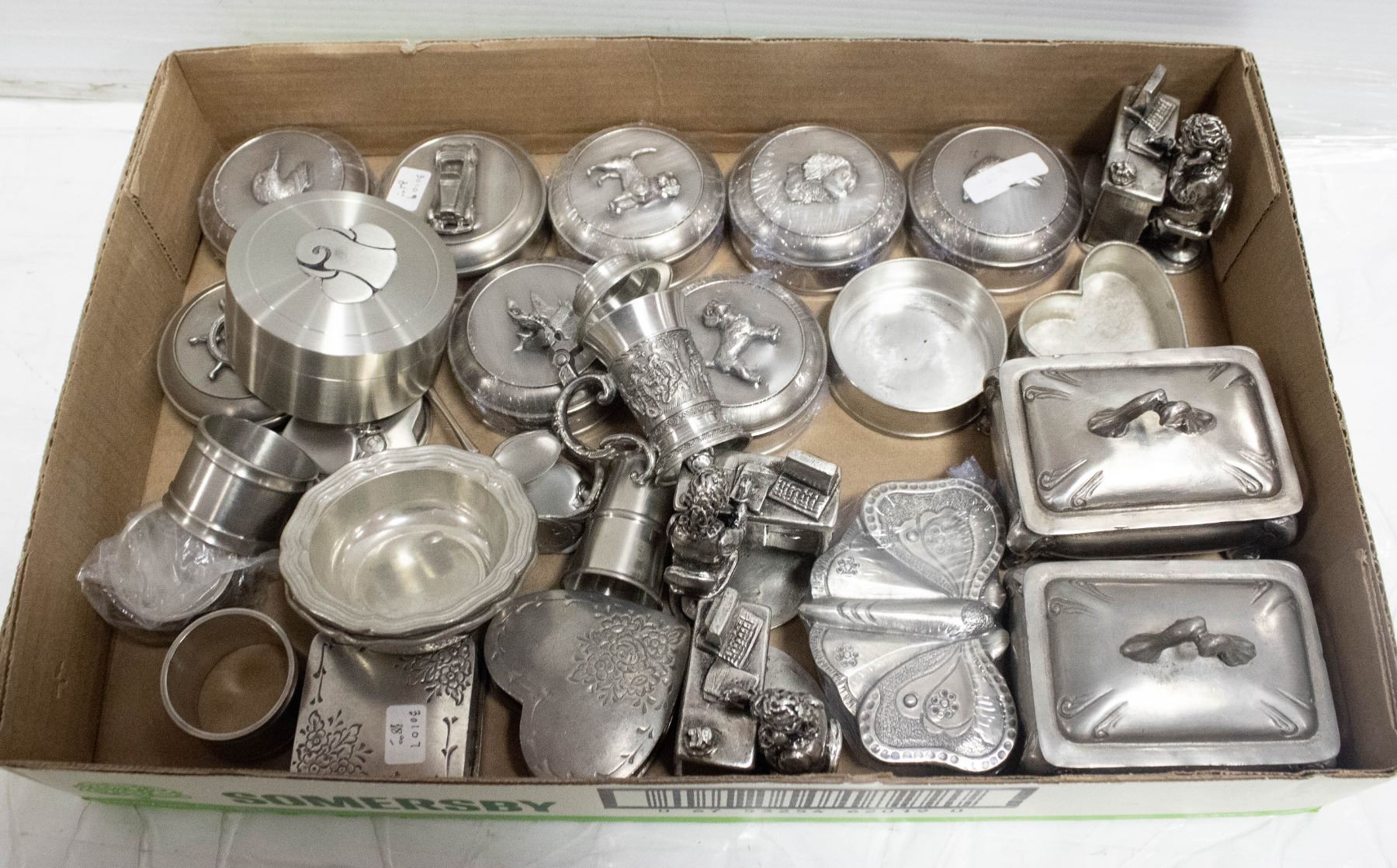 FLAT OF PEWTER CONTAINERS