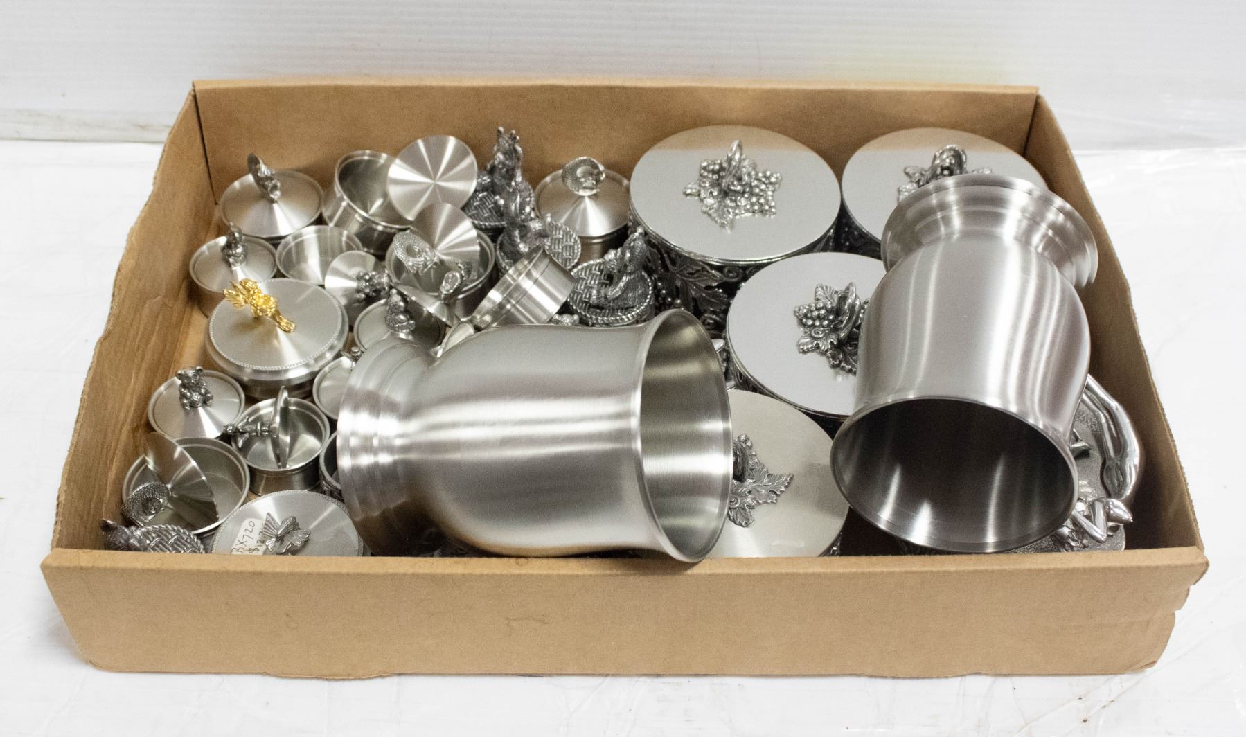 FLAT OF PEWTER CONTAINERS