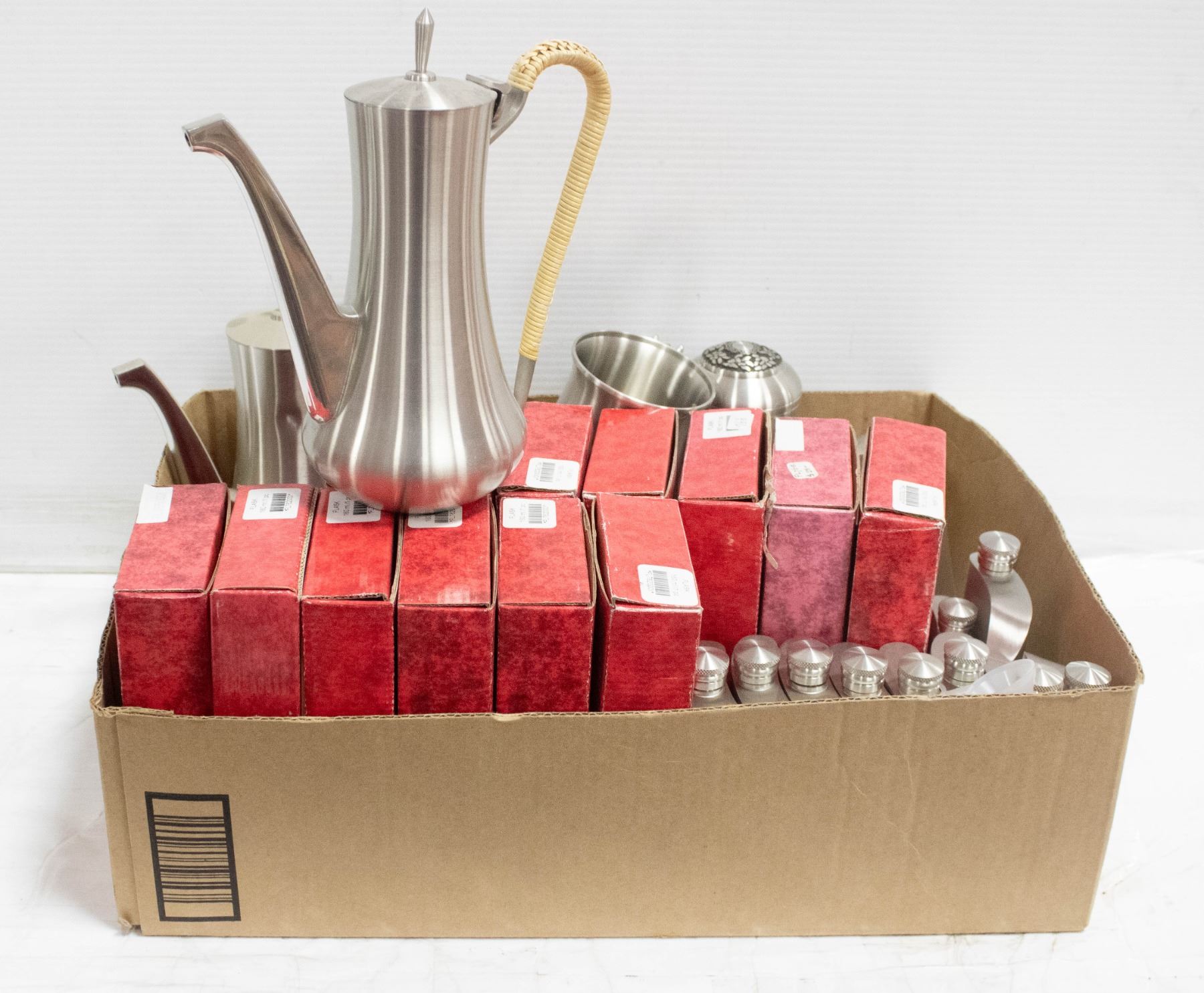 FLAT OF PEWTER FLASKS CUPS AND MORE
