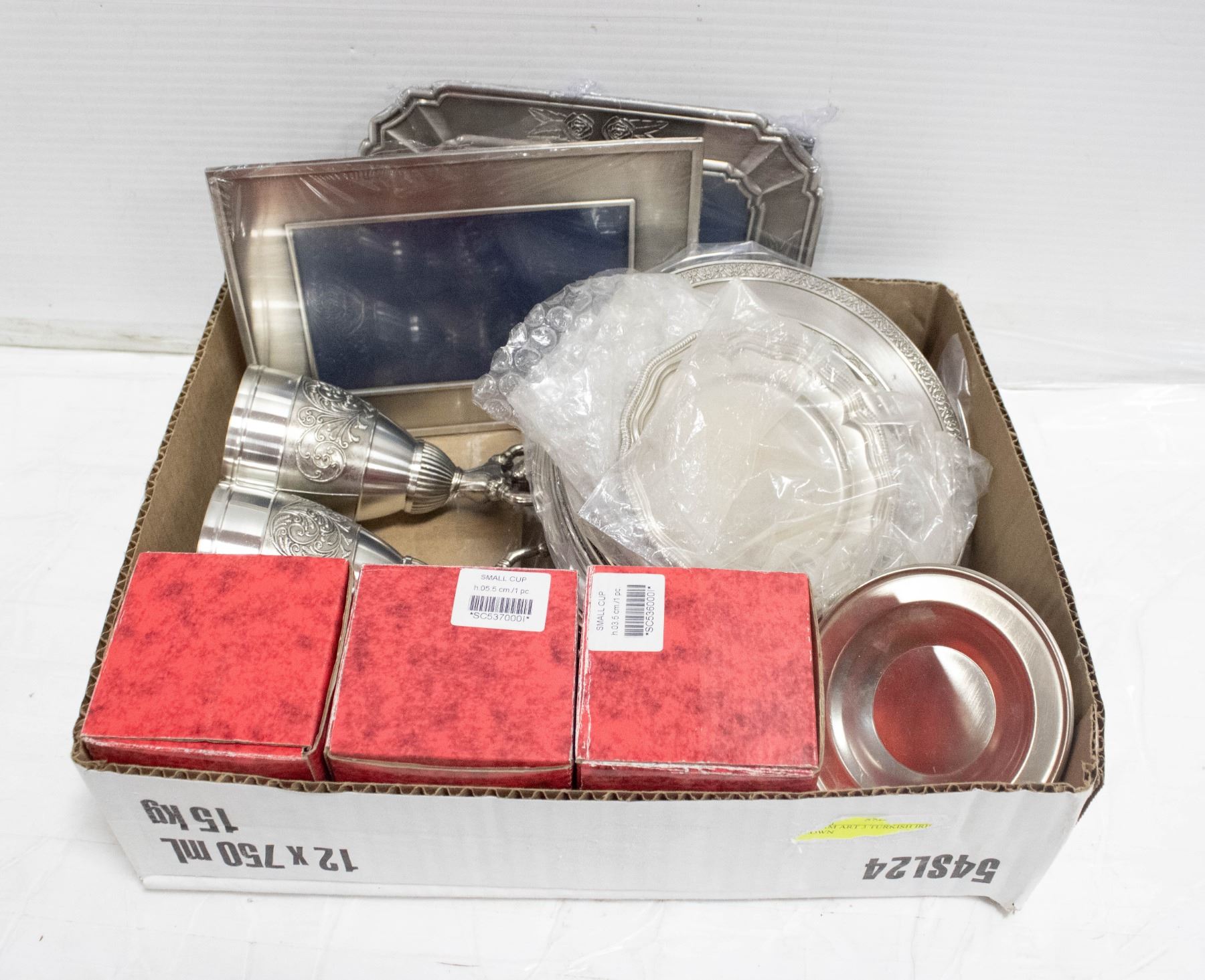 FLAT OF PEWTER PLATES, CUPS AND FRAMES