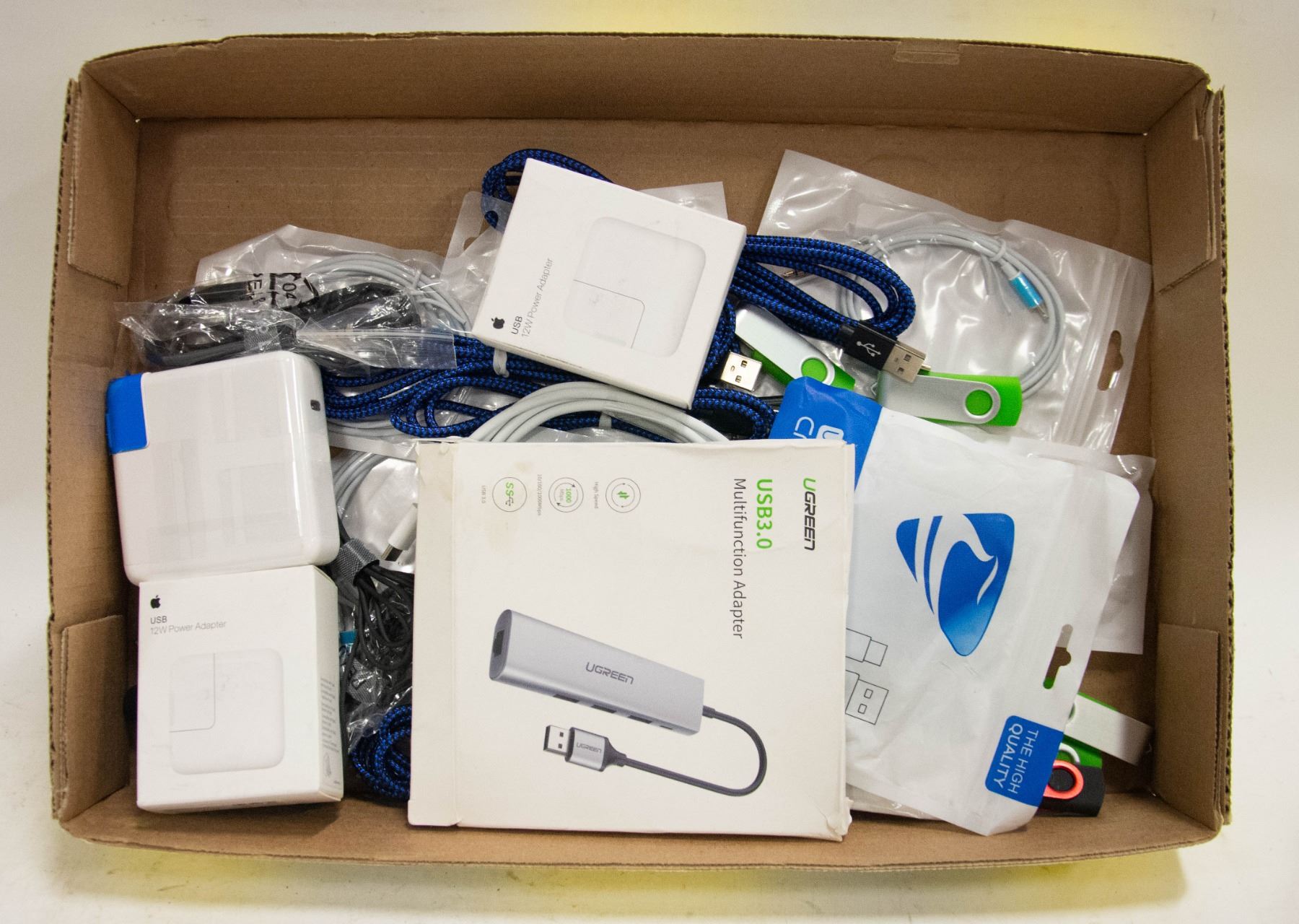 FLAT OF PHONE CHARGERS COMPUTOR CABLES ETC