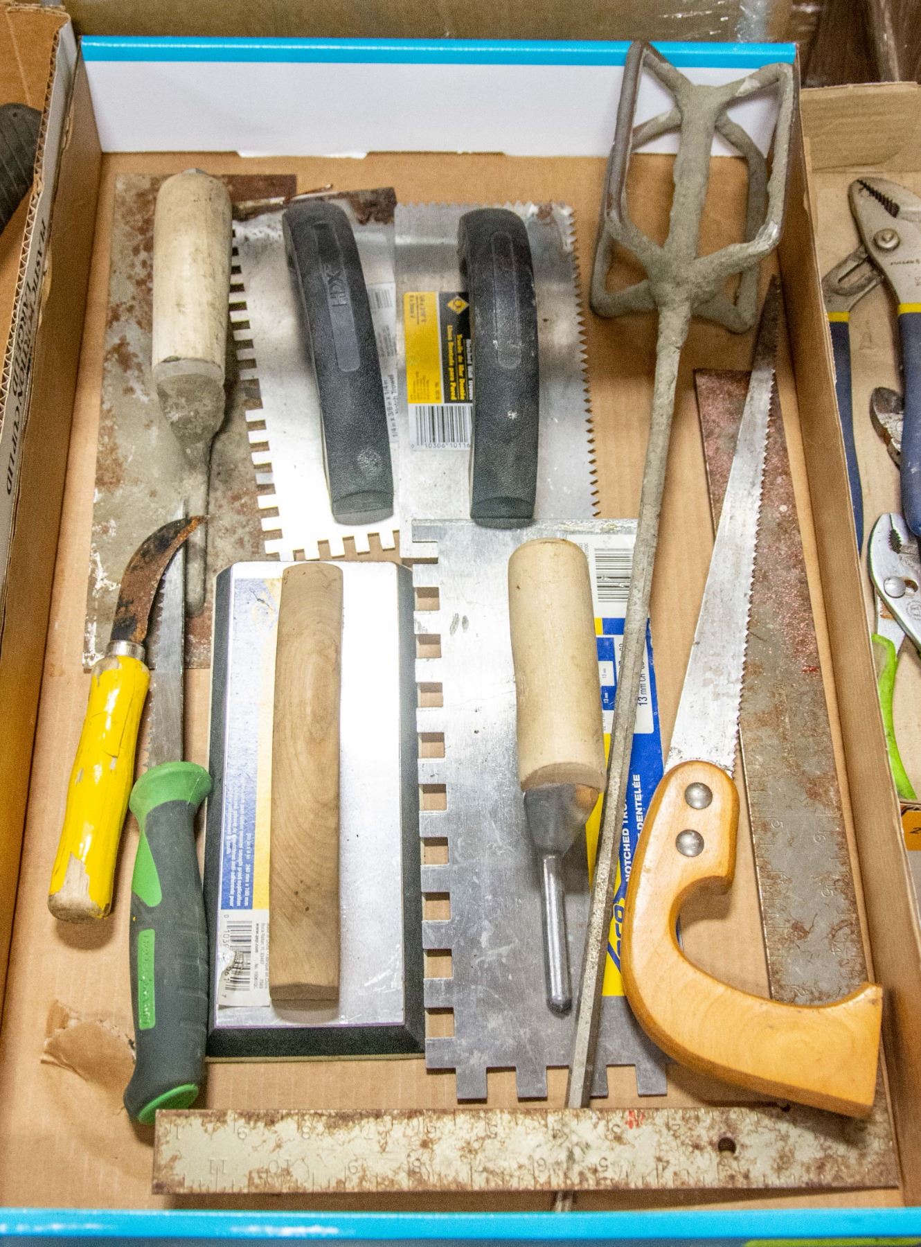 INCL. NEW QEP GUMRUBBER GROUT FLOAT, NOTCHED TROWEL, NOTCHED WALL TROWEL, SQUARE NOTCH TROWEL, LARGE MIXER BIT, SAWS, KNIVES, SQUARE, ETC.