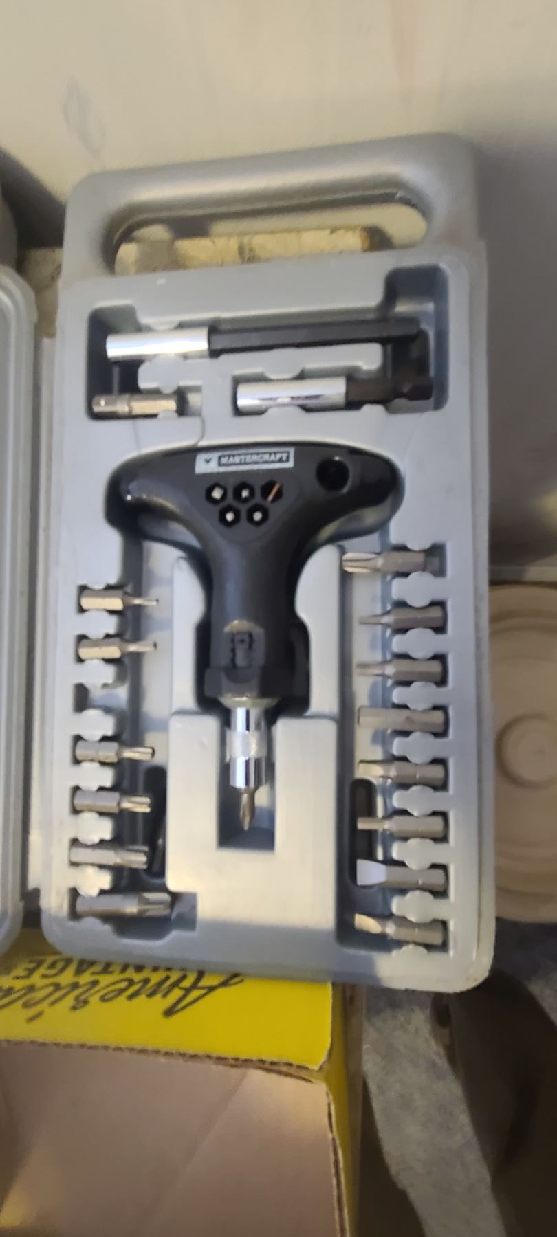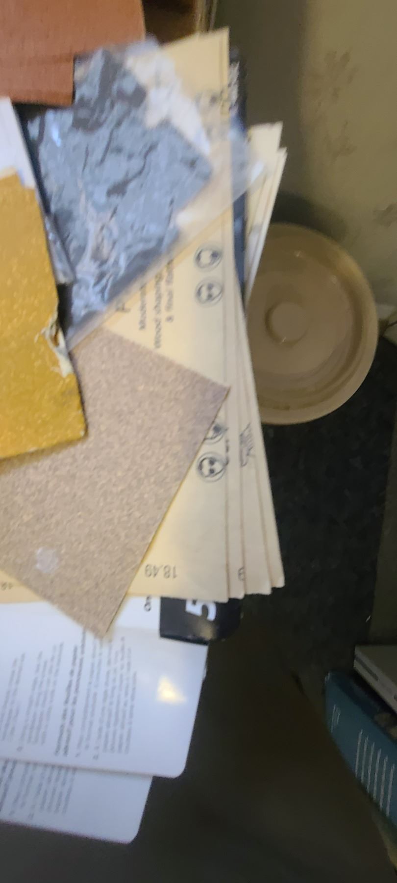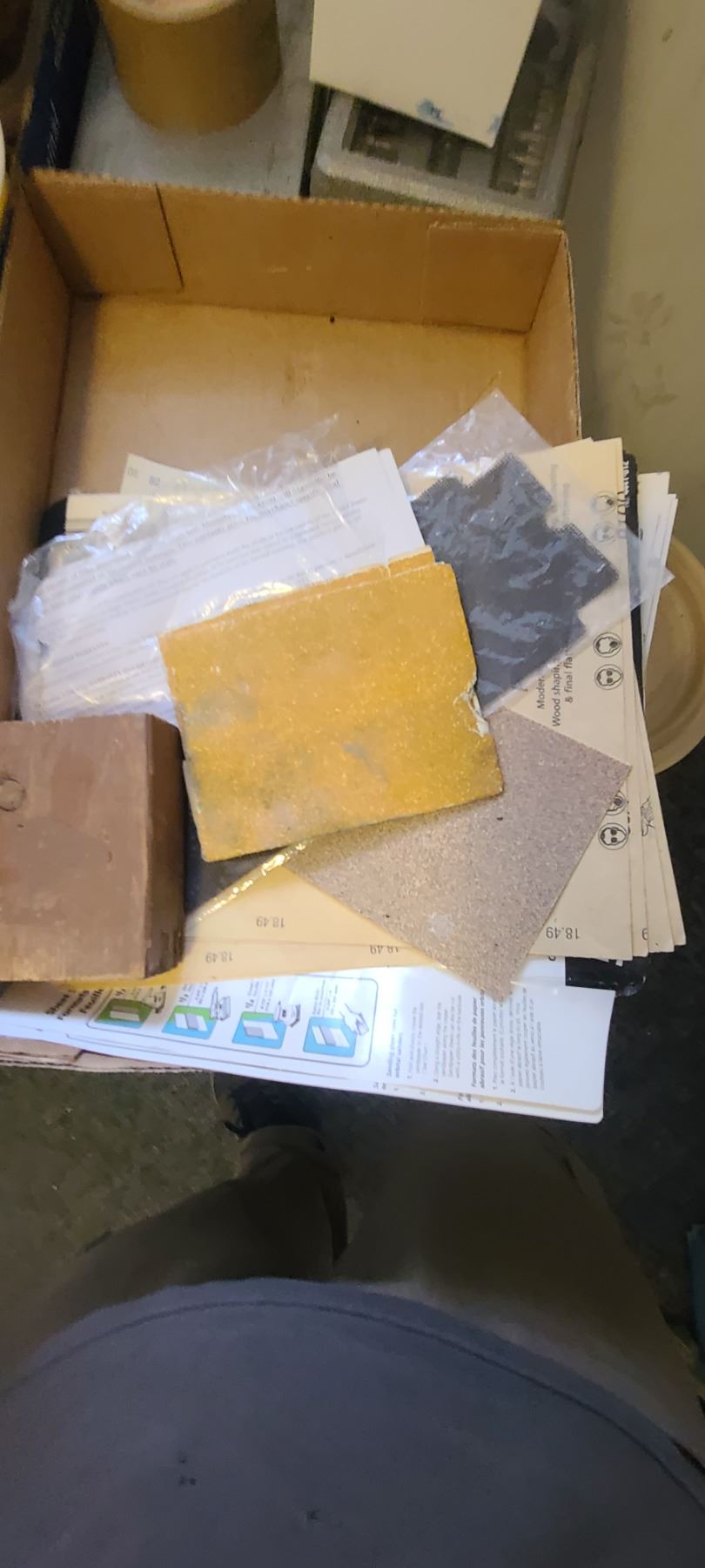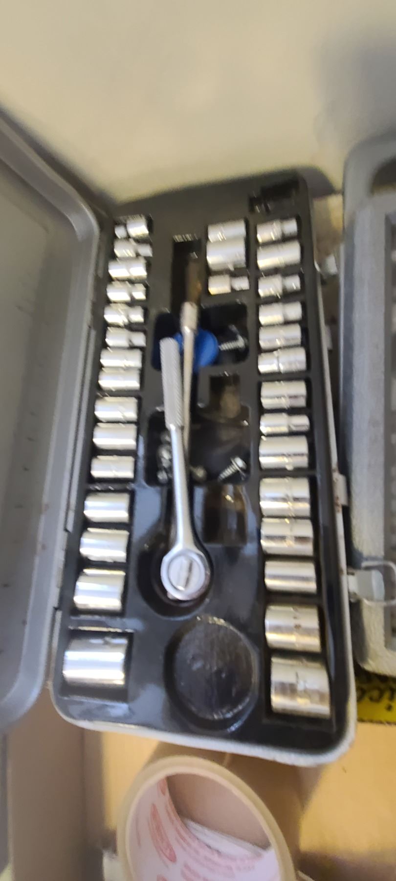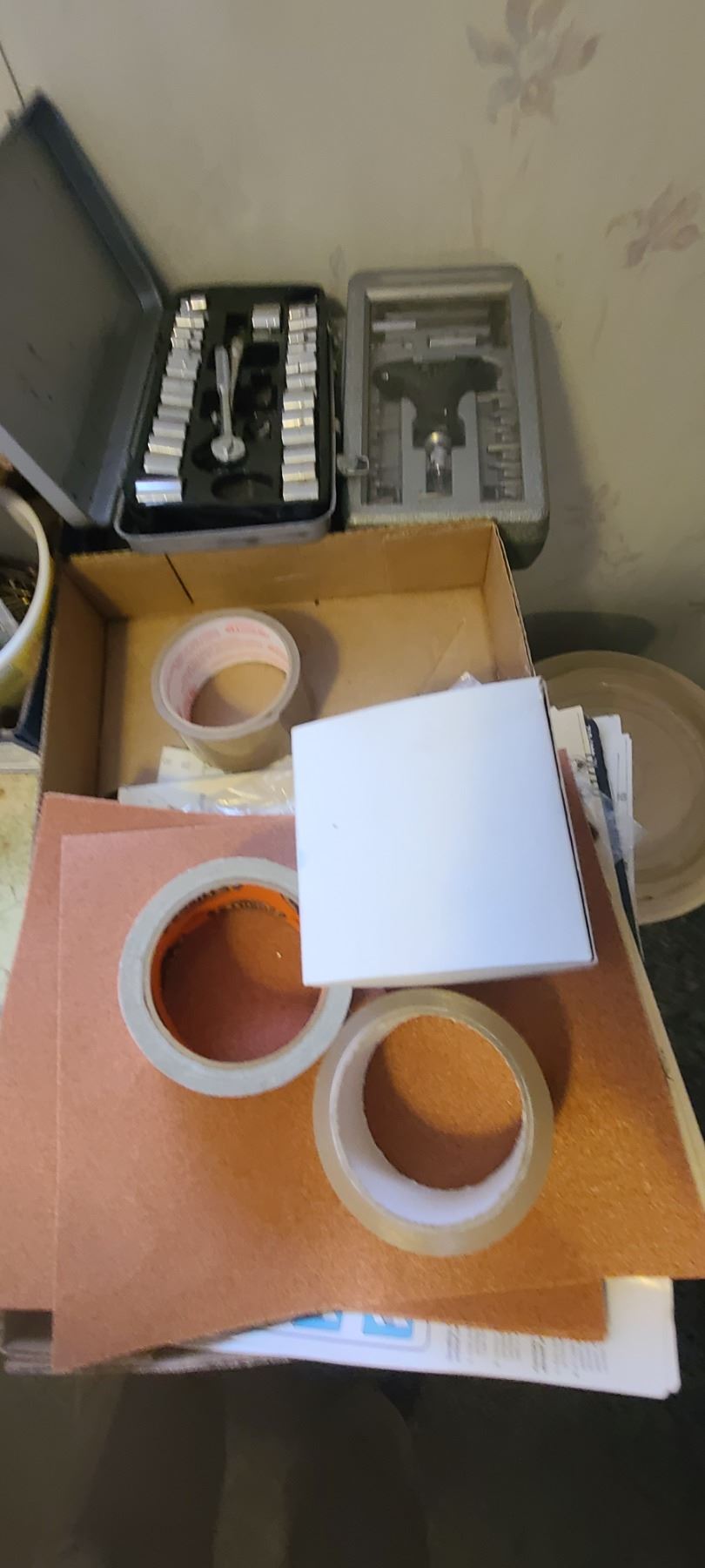 FLAT OF SANDPAPER, SOCKET SET AND RATCHETING SCREWDRIVER