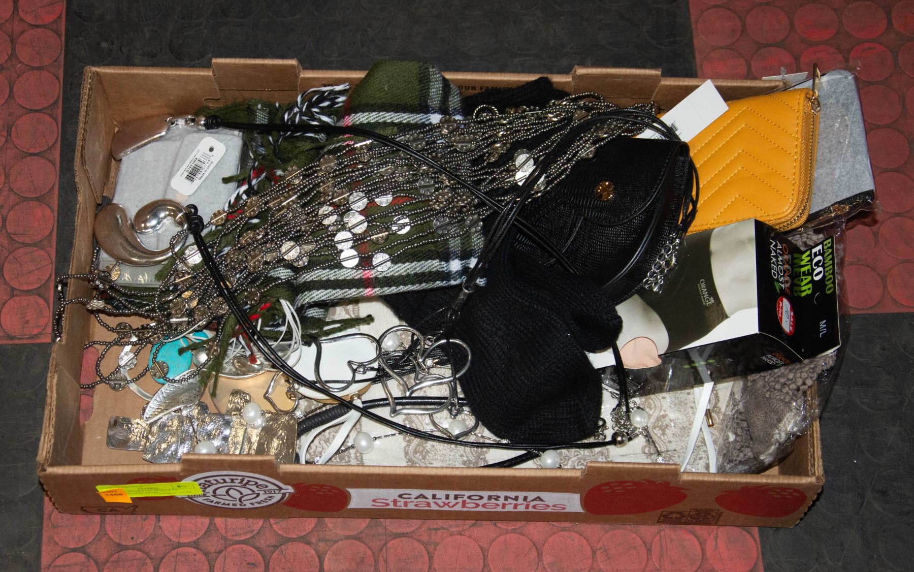 FLAT OF SCARVES, WALLETS, JEWELRY AND MORE