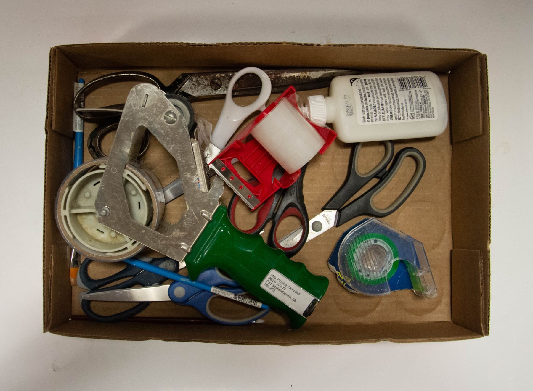 FLAT OF SCISSORS PLUS TAPE AND TAPE GUN AND MISC
