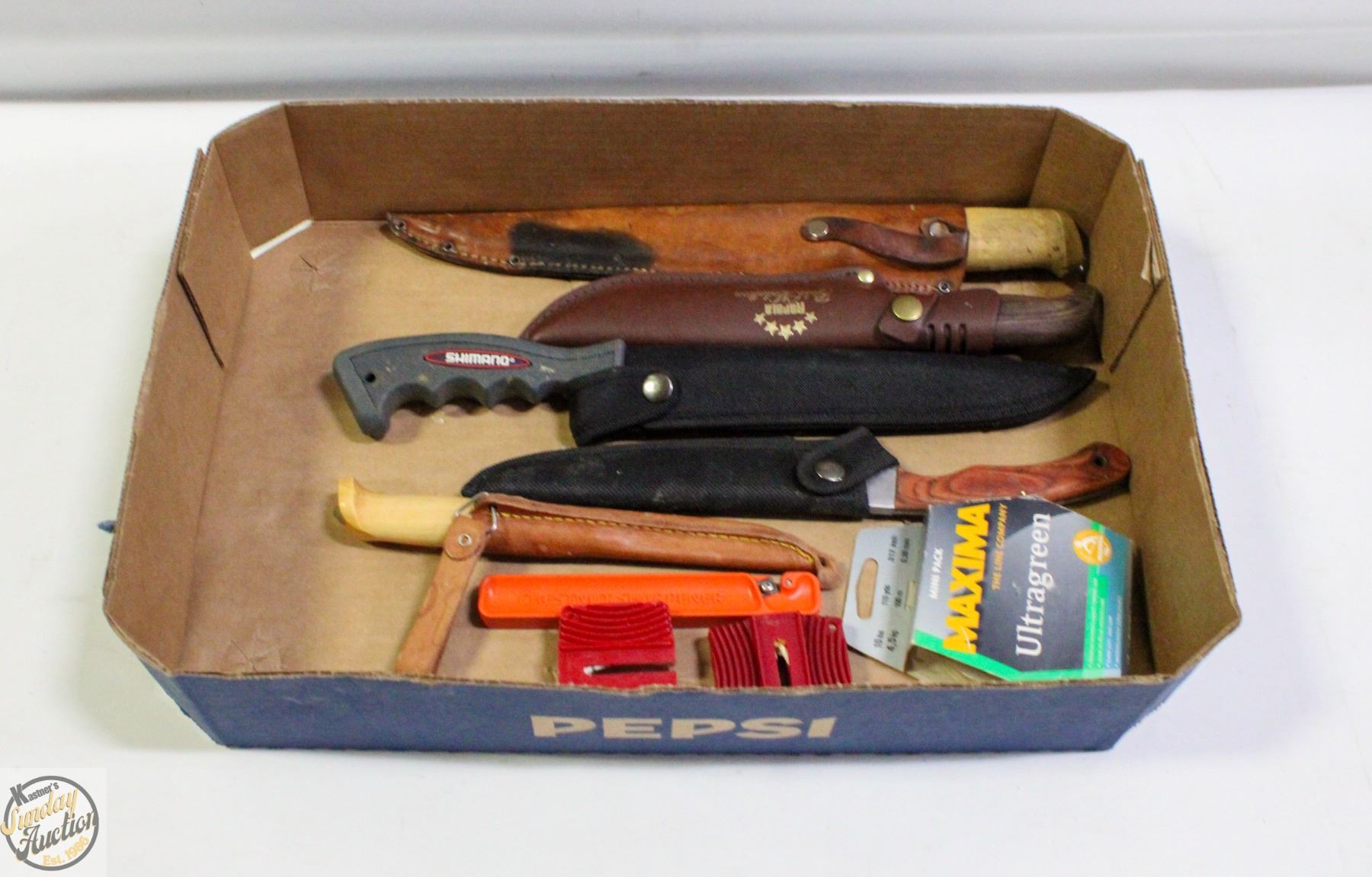 FLAT OF SHEATHED KNIVES ASSORTED + FISHING LINE