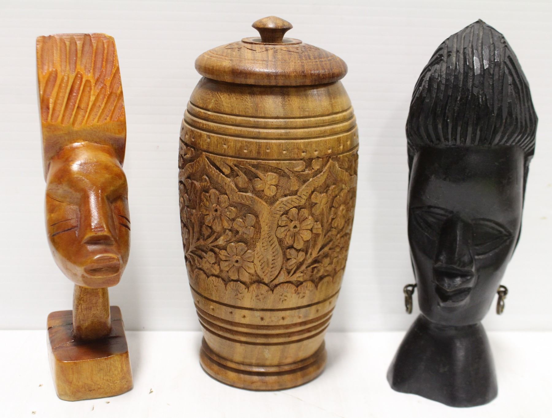SOLID WOOD HEAD STATUE PAINTED BLACK W/ EARRINGS, LIGHT TAN HEAD STATUE. SOLID WOOD CARVED JAR