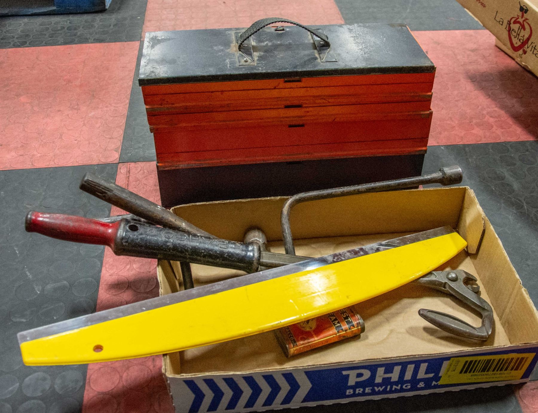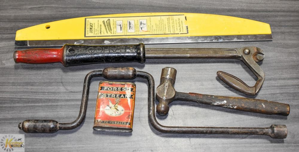 FLAT OF TOOLBO TIN, HAMMER, NAIL PULLER, DRILL &