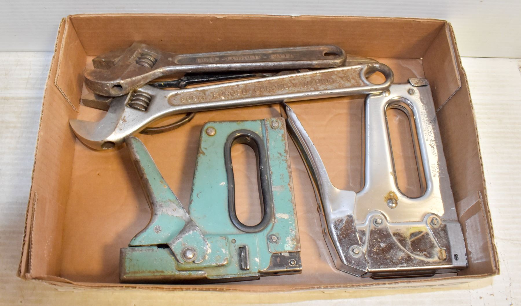 FLAT OF TOOLS INCLUDES STAPLES GUNS AND MORE