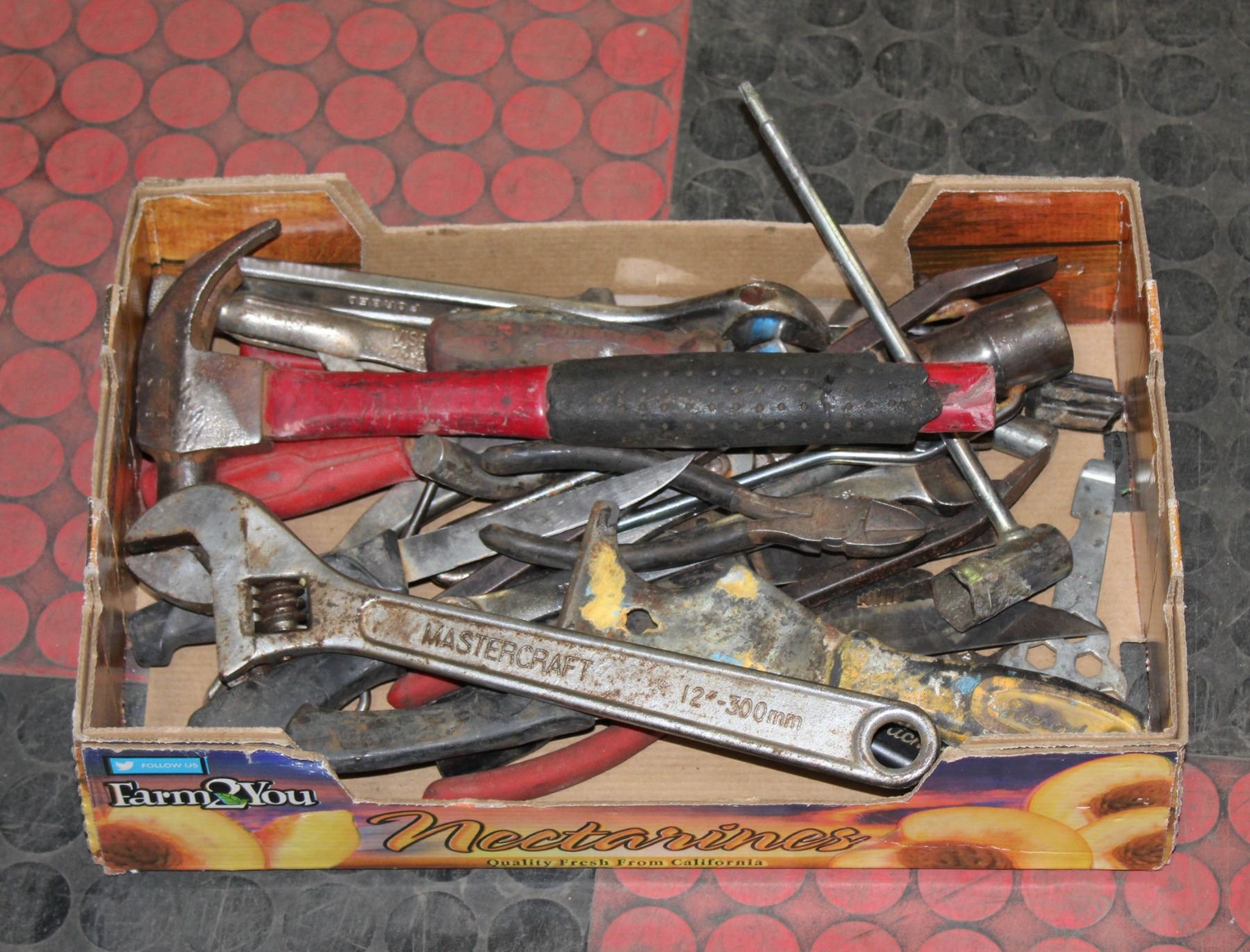 FLAT OF TOOLS INCLUDES WRENCHES, HAMMERS AND MORE
