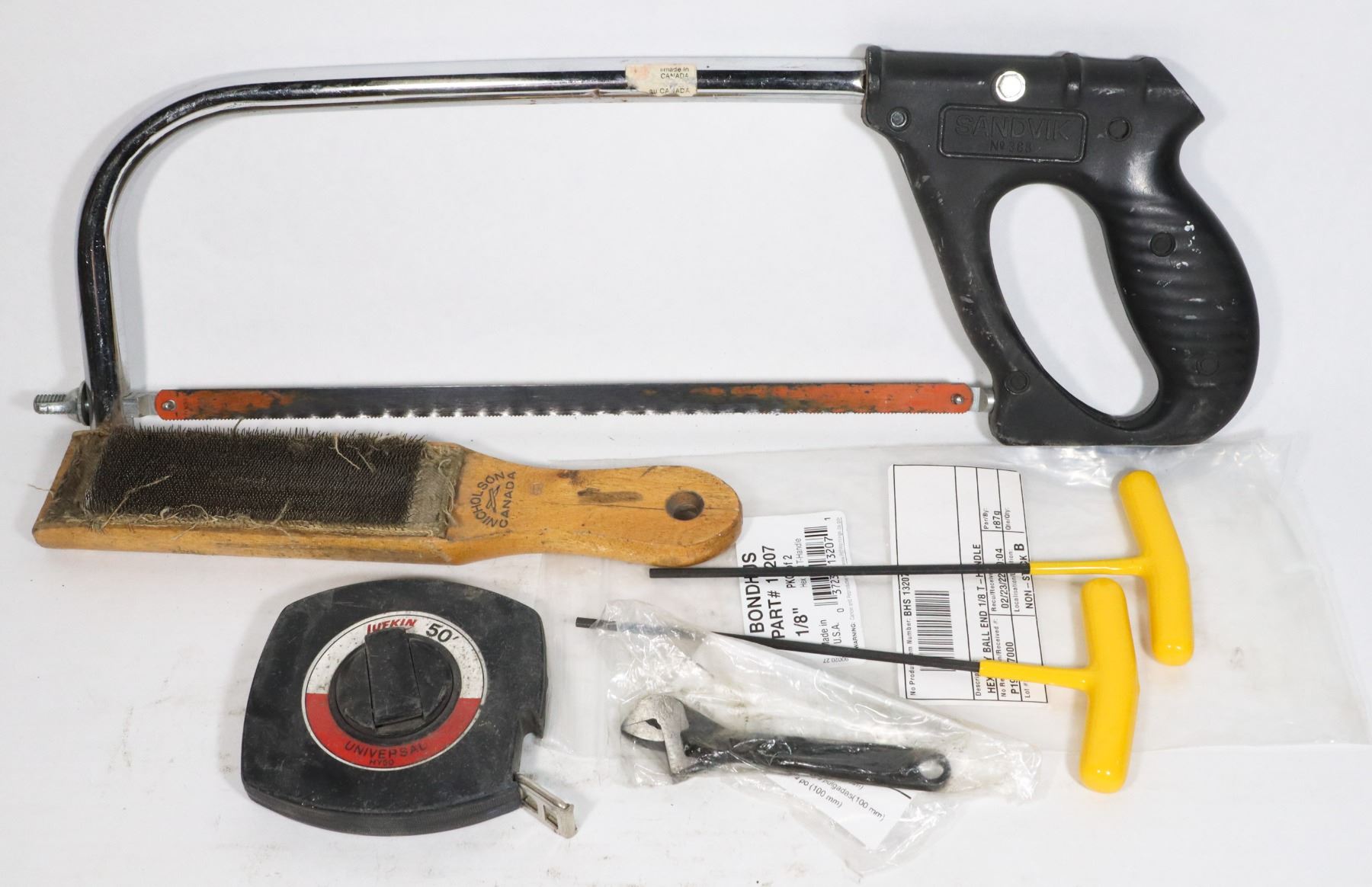 FLAT OF TOOLS INCLUDING HACK SAW, LUFKIN 50'