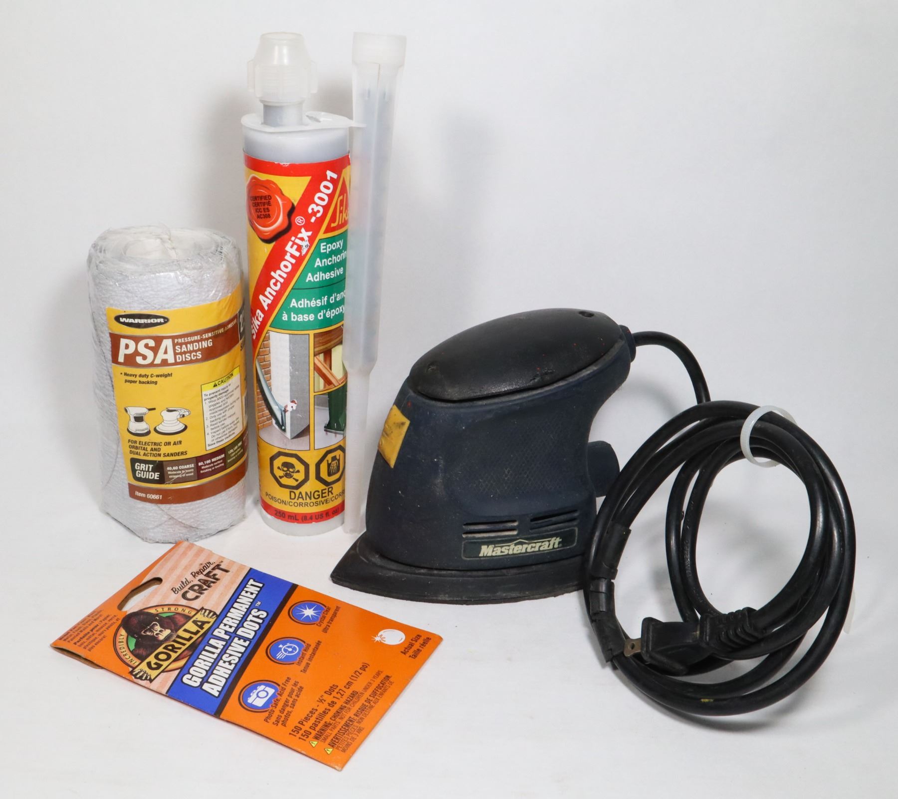 EPOXY ANCHORING ADHESIVE, 220 GRIT SANDING DISCS, GORILLA PERMANENT ADHESIVE DOTS, AND WELL USED WORKING SANDER.