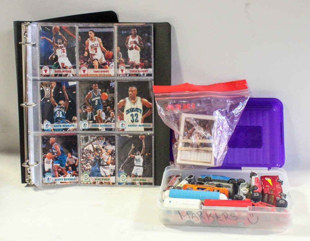 FLAT OF TOY CARS & BINDER OF HOOPS CARDS