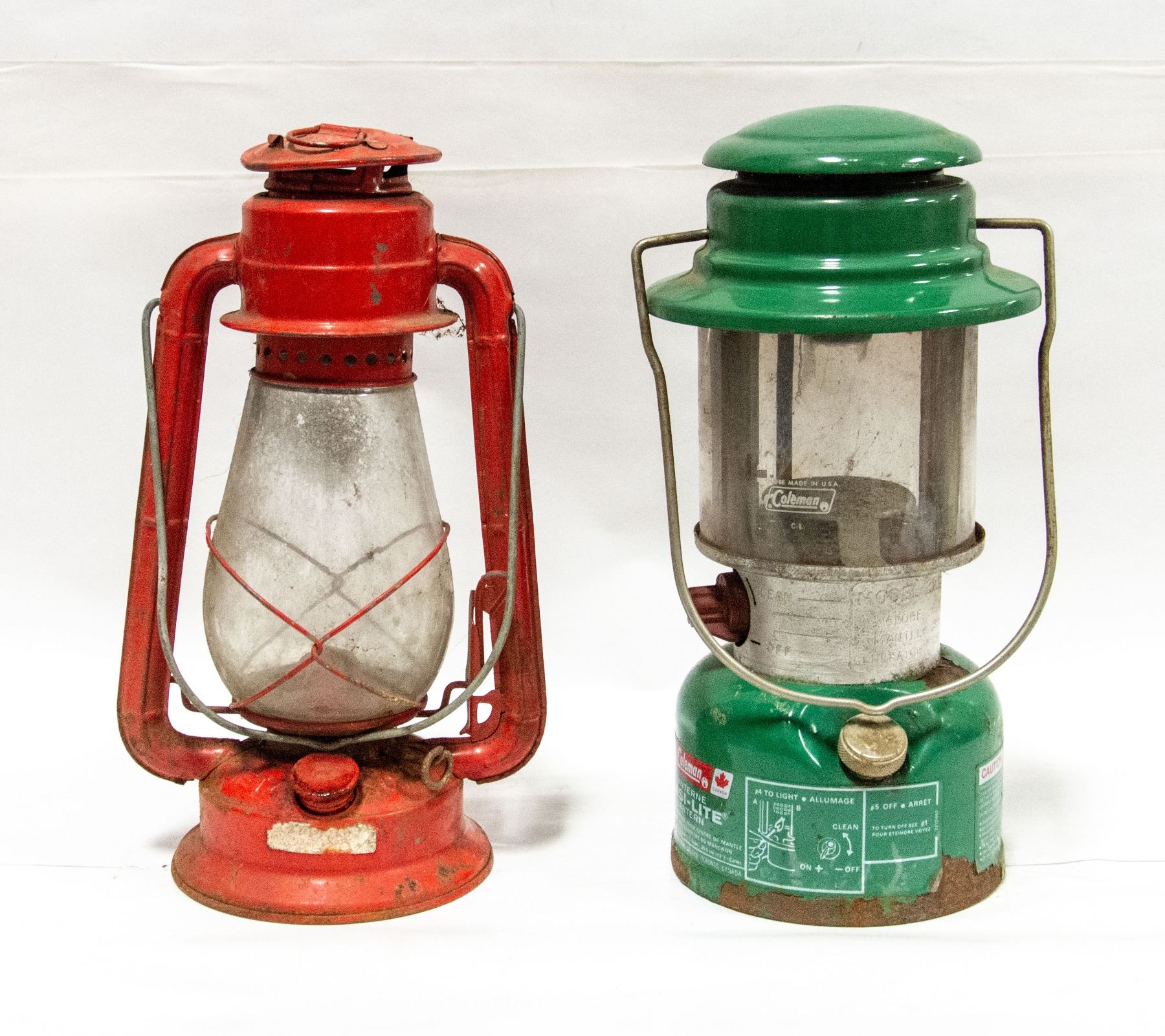 FLAT OF TWO COLEMAN LANTERNS ONE GLOBE HAS CRACK