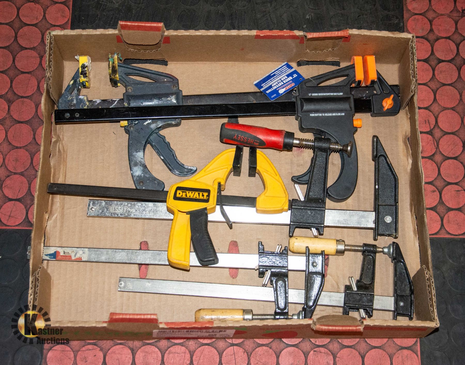 HAND RATCHET BAR CLAMPS WITH QUICK RELEASE, ONE - 10" BESSY BAR CLAMP, TWO 9"-ALL METAL BAR CLAMPS WITH HAND SCREW TIGHTENERS AND DEWALT 8"-HAND RATCHET BAR CLAMP **ALL ITEMS MUST BE REMOVED BY 5PM SATURDAY, FEBRUARY 24TH 2024. ALL REMAINING ITEMS WILL BE SUBJECT TO A $6.00 PER DAY STORAGE CHARGE. ANY ITEMS REMAINING AFTER MONDAY, MARCH 11TH, 2023 WILL BE CONSIDERED FORFEITED. NO REFUNDS WILL BE ISSUED FOR FORFEITED ITEMS. TO SCHEDULE A PICK UP APPOINTMENT CLICK HERE